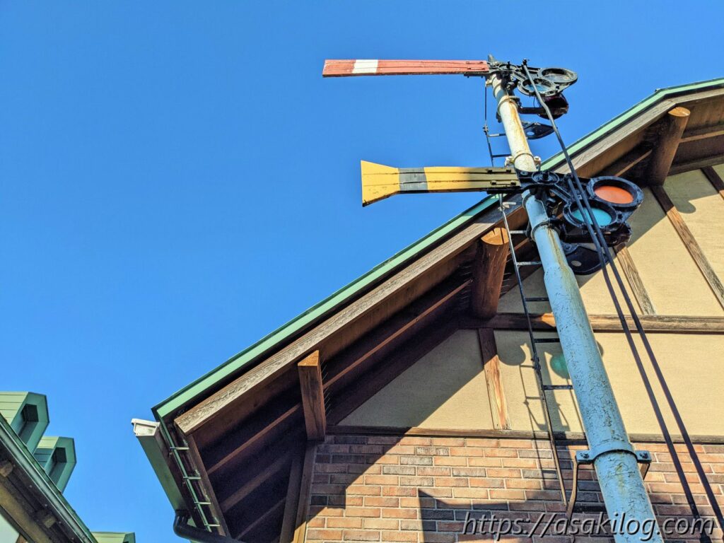日付入りの記念撮影コーナーもあります。またその上を見上げると、腕木式信号機も展示されていました。