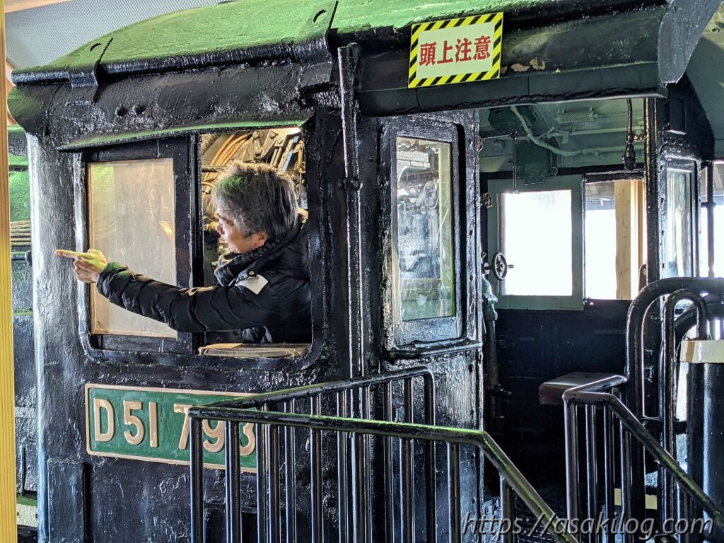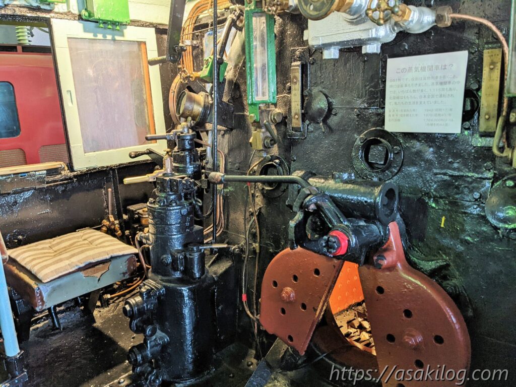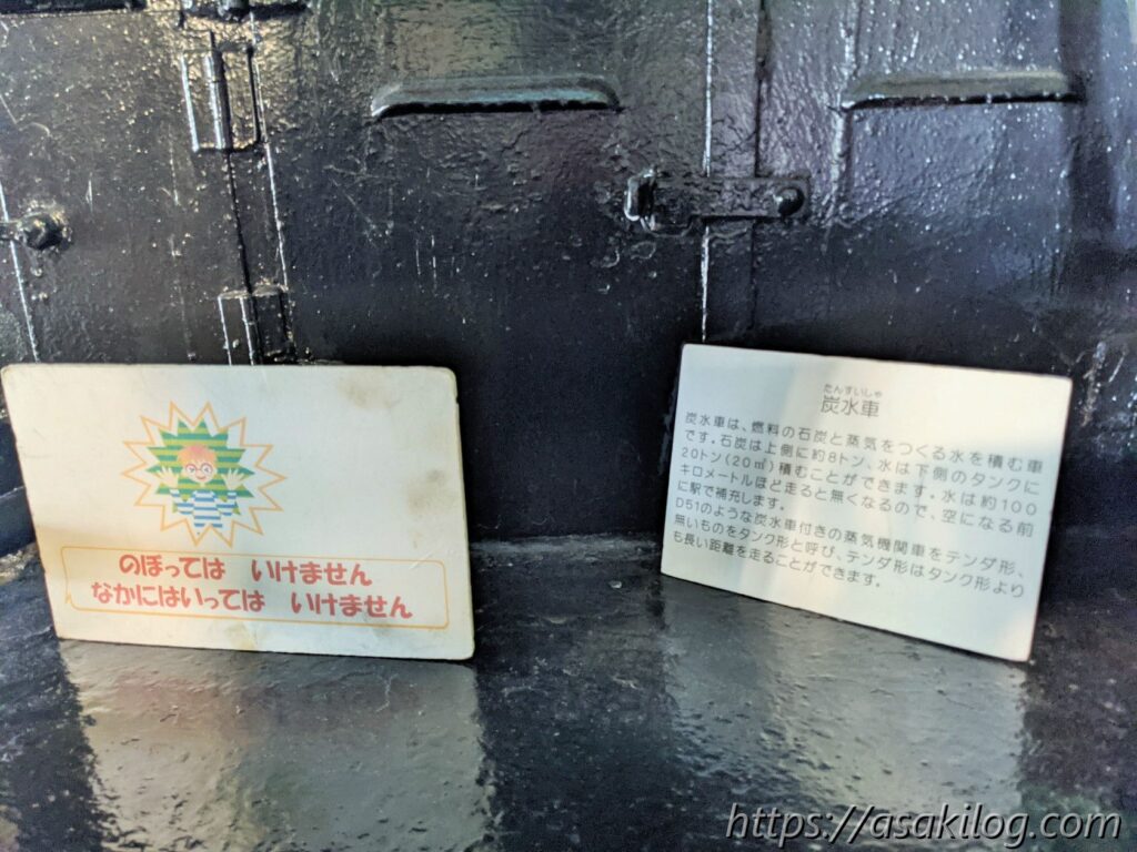 左の写真、デゴイチのナンバープレートは昭和レトロ感あり。右の写真の階段を上ると、車両の中の運転席を見学できます。