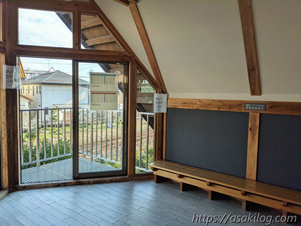 屋外デッキ目の前・すぐそばには本物の北陸線の線路があり、電車が目の前を走り抜ける姿を見られるそう。