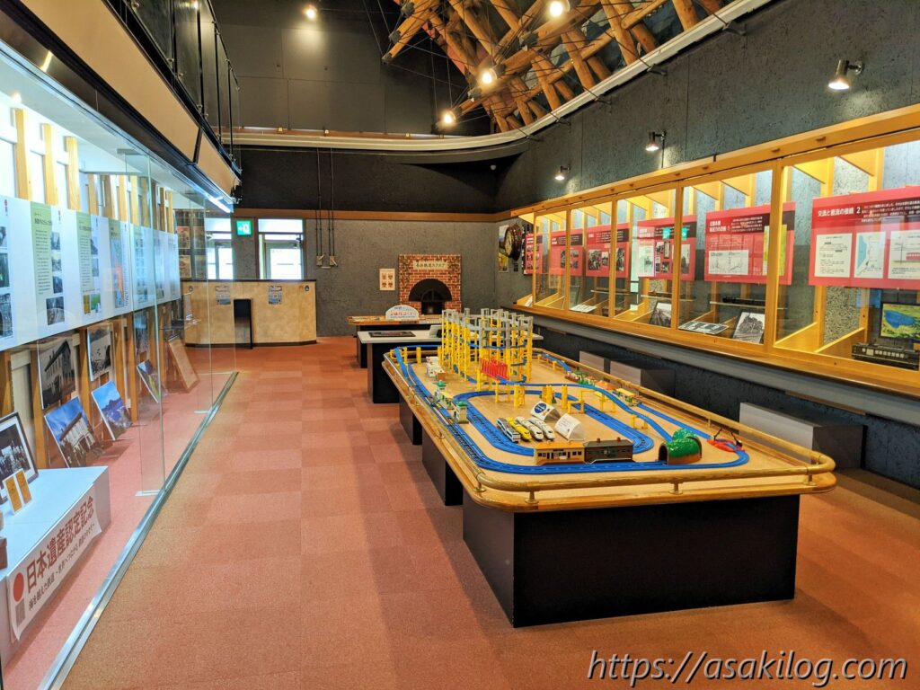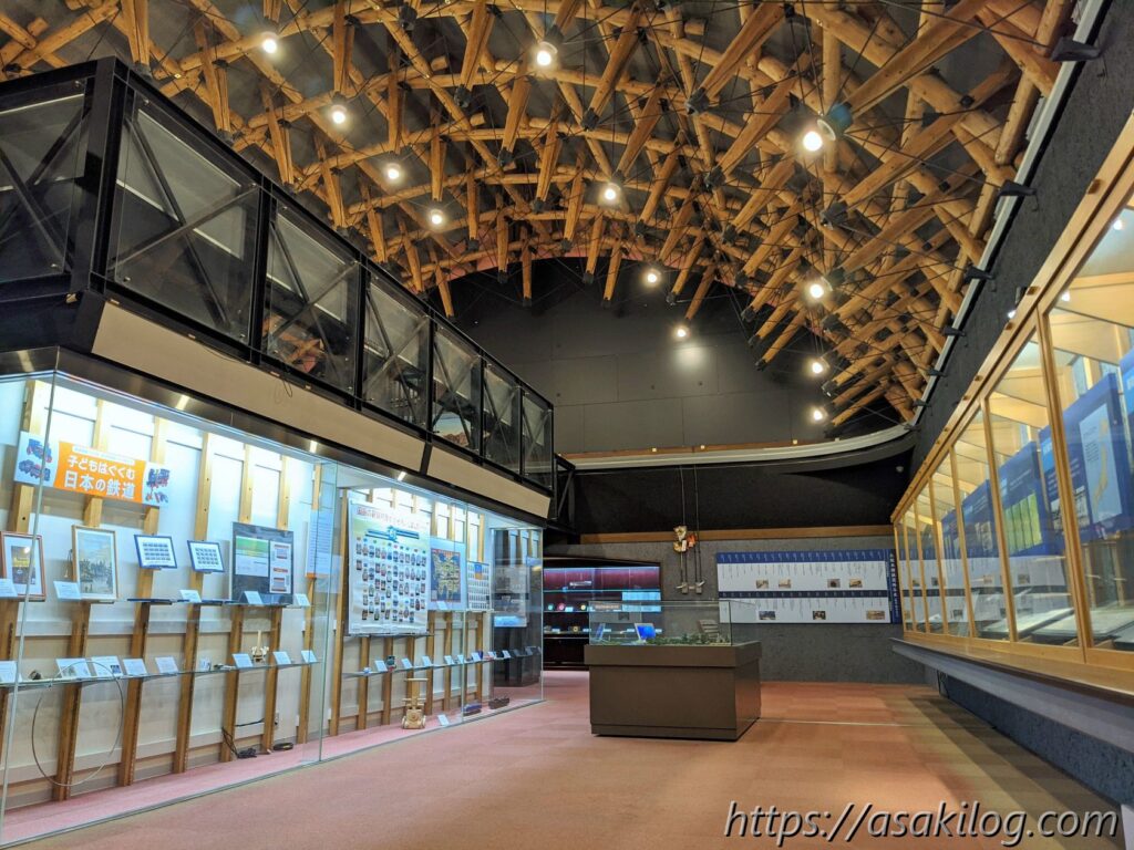 長浜鉄道文化館・館内の天井はヨーロッパのターミナルを模した木造のアーチ作りで、日本初の鉄道連絡船に関する資料・鉄道模型車両の展示、昔の写真やジオラマを使って当時の様子を紹介など、明治時代~現在に至るまでの鉄道史を多数展示しています。