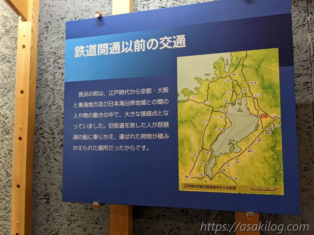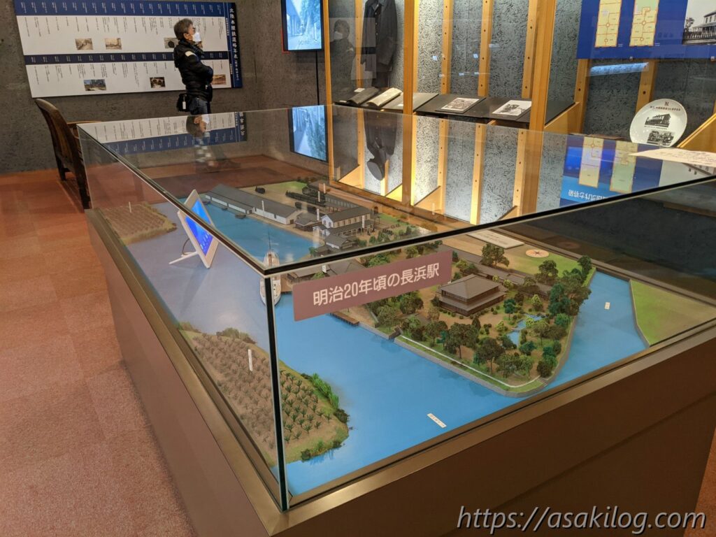 長浜鉄道文化館に入って右側のコーナーでは、さまざまな資料を展示。左の写真には鉄道開通以前の交通マップが示されていて、京都・大阪と東海地方・日本海沿岸エリア間で長浜の町が大きな接続点だったことが分かります。そして右の写真は、明治20年頃の旧長浜駅の推定模型(ジオラマ)です。
