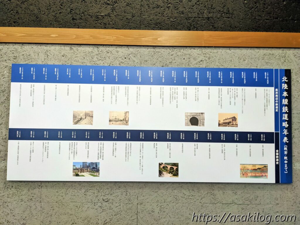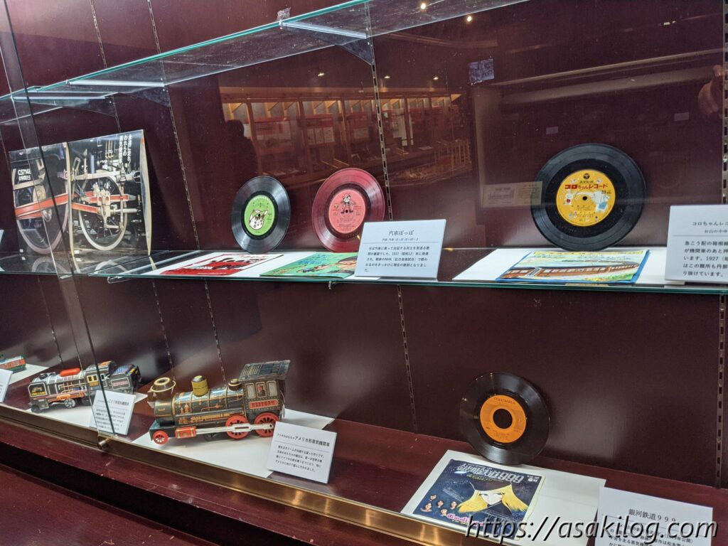 奥のコーナーには、北陸本線鉄道略年表や、鉄道がテーマの懐かしいレコード、ブリキのおもちゃなどを展示。