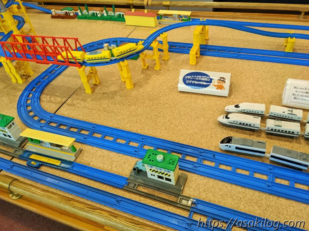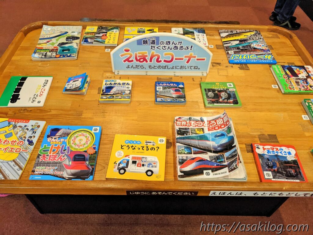 左側のコーナーには、遊び心くすぐる空間が広がっています。おもちゃのプラレールで実際に遊んだり、えほんコーナーにある鉄道に関する絵本を自由に読むことができますよ。