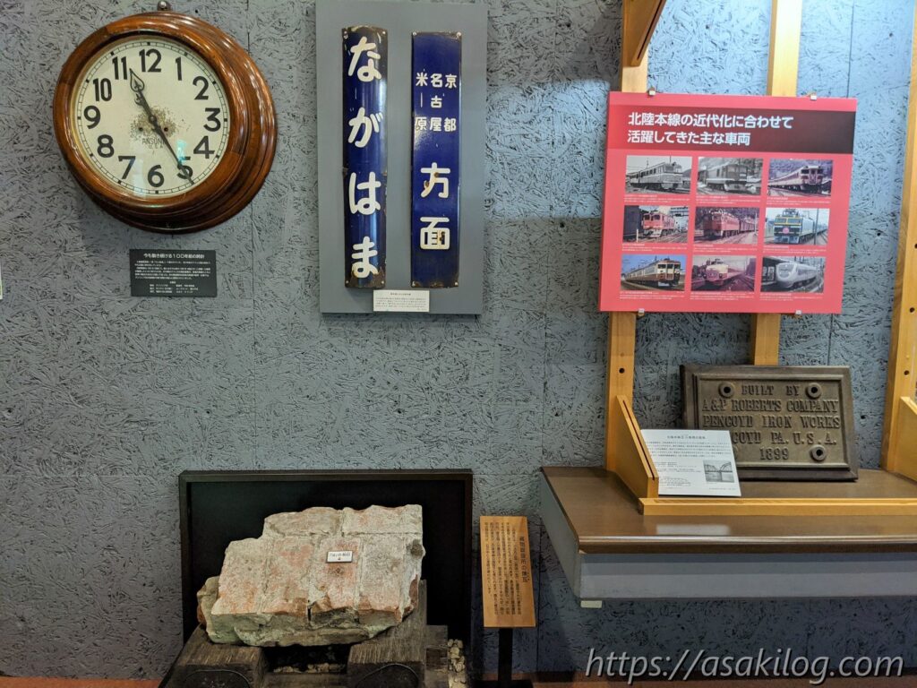 左の写真には、1882年(明治15年)に建設された貨物取扱所の基礎に使われていた煉瓦や、七尾線西岸駅で使われていた今も動き続ける100年前のアメリカ製時計、長浜駅の第3代目駅舎(昭和25年~58年)に使われていた駅名標とのりば案内標、北陸本線庄川鉄道の銘板など、貴重なものを多数展示。