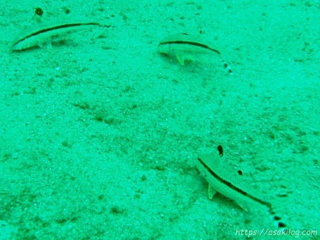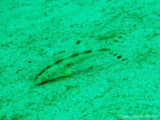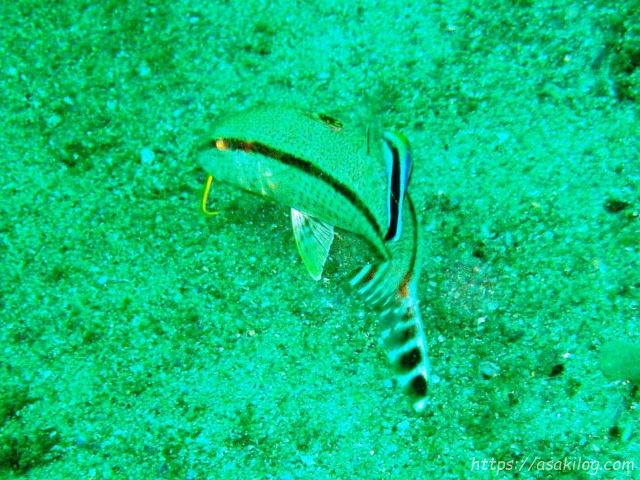 ヒメジ自体は、ちょっと地味な魚ですが、違う場所に移動したら、なんと今度は「ホンソメワケベラ」がくっついてるのを発見しました。