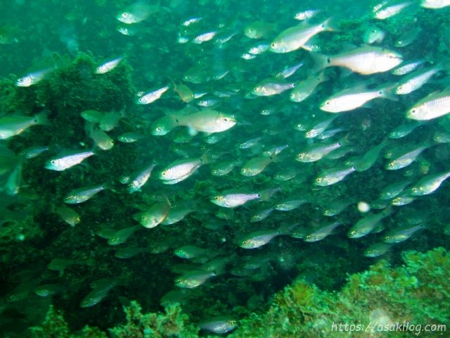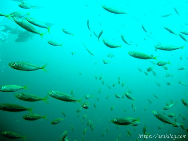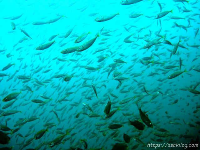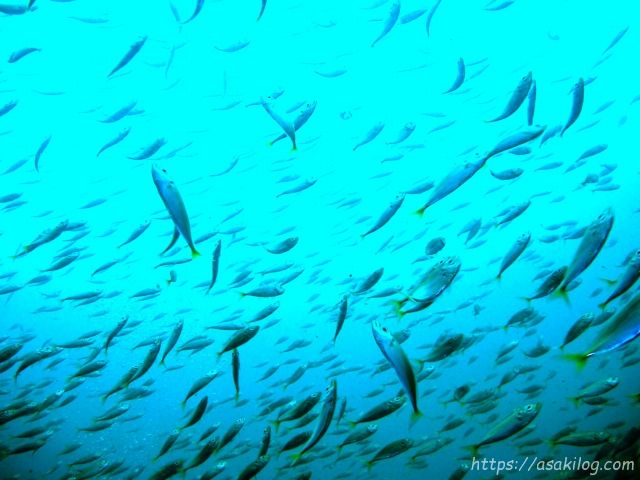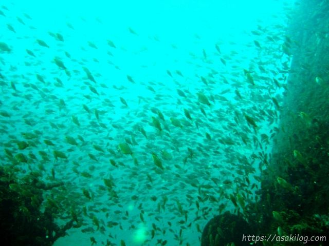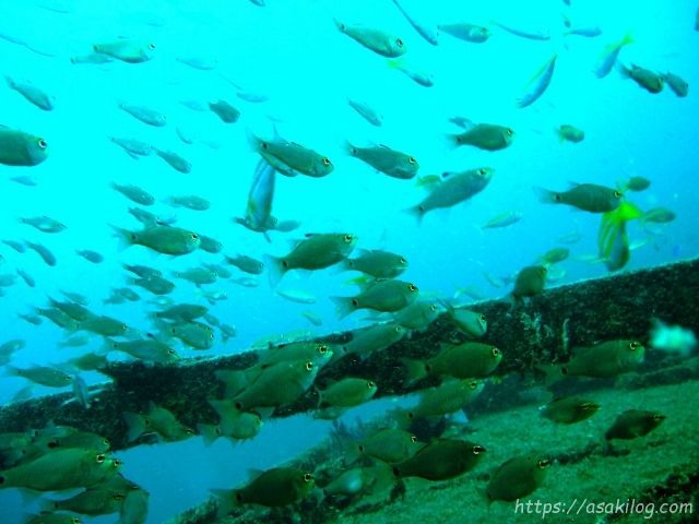 こちらは沈船スポットで撮ったマメアジ、カンパチ、ネンブツダイの群れの写真です。