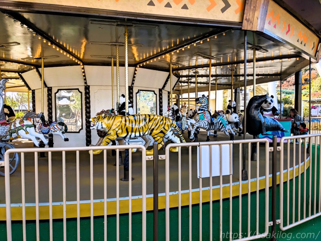 メリーゴーランドの動物の種類が一般的な馬だけではなく、アドベンチャーワールドで人気のパンダ・アシカ・トラなどになっているのがユニークですね(笑)