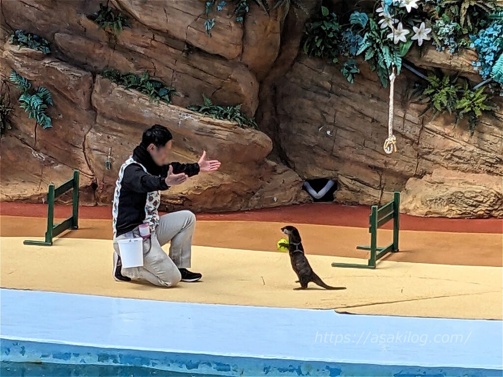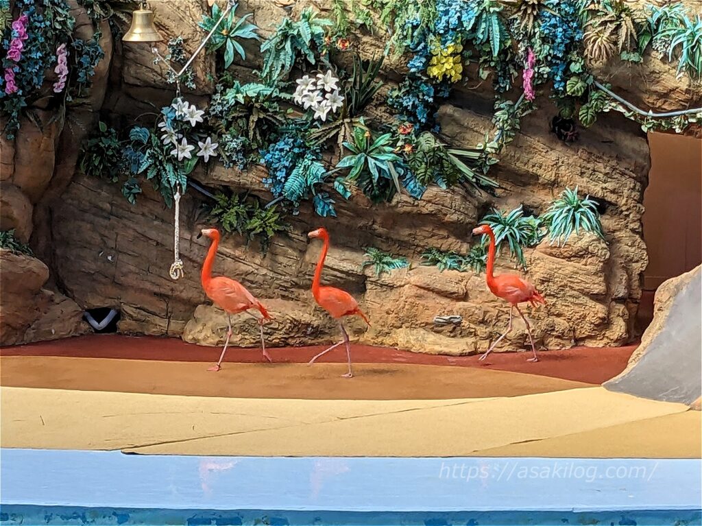 カリフォルニアアシカや犬、ペンギン、ゴマフアザラシ、カピバラ、フラミンゴ、ミニブタ、ハリスホークなど、いろいろな動物たちが入れ替わりで登場。元気いっぱいのパフォーマンスを見せてくれます。約20分とそれほど長くありませんが、とても楽しい時間を過ごせました。