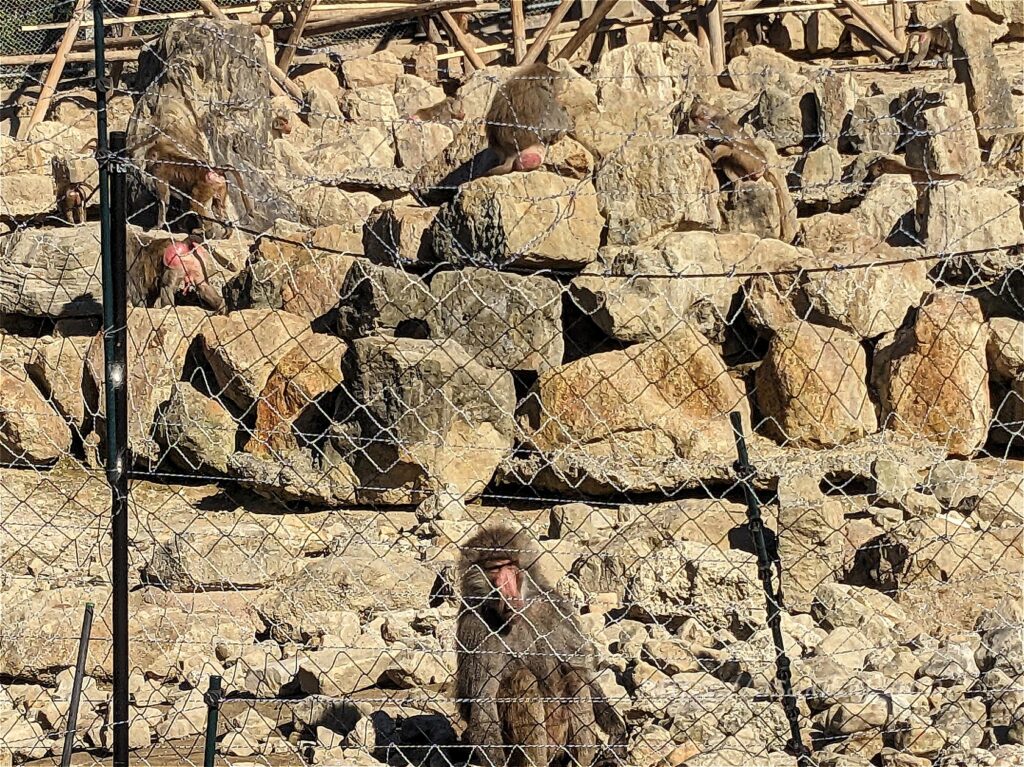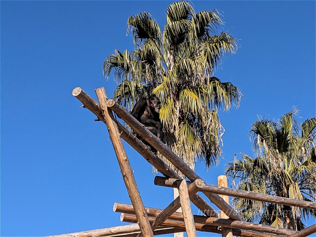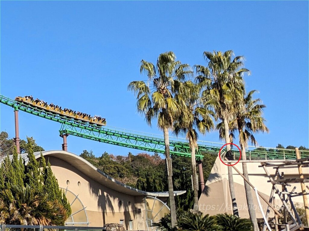 ファミリー広場にもいろいろな動物がいるのですが、ジェットコースターの右側に何やら黒い影が・・(赤丸部分)。下から見上げてみると「チンパンジー」でした。