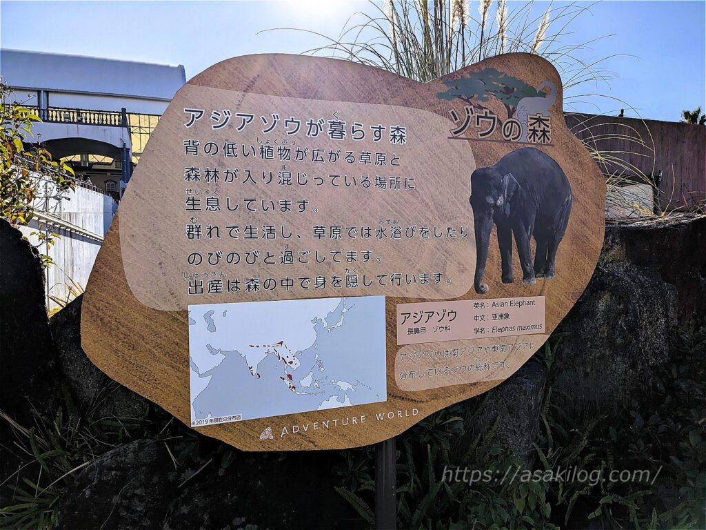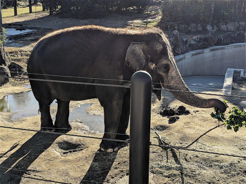 前述のサファリワールドには「アフリカゾウ」がいましたが、園内のゾウの森には「アジアゾウ」がいます。アフリカゾウと比べて体が小さい&背中が丸くて、小さな四角形の耳が特徴。ゾウの森は、アドベンチャーワールドのエントランス近くにあるため、朝と帰りの2回見ることができました。