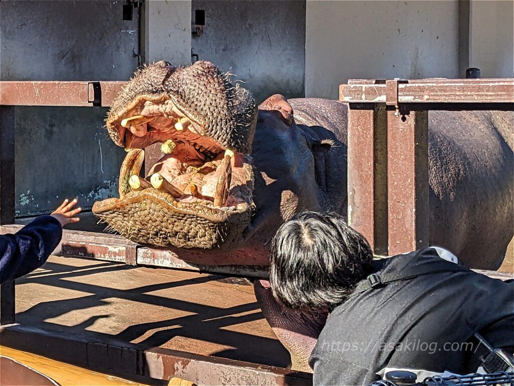 ふれあい広場には、大きな「カバ」が! 私が立ち寄った時は、カバにおやつをあげられる「カバフィーディング」を行っていました(1回500円)。カバの大きな口におやつを投げ込むだけなのですが、うちの娘さんは怖がりなので、その様子を眺めるだけで終わりました。