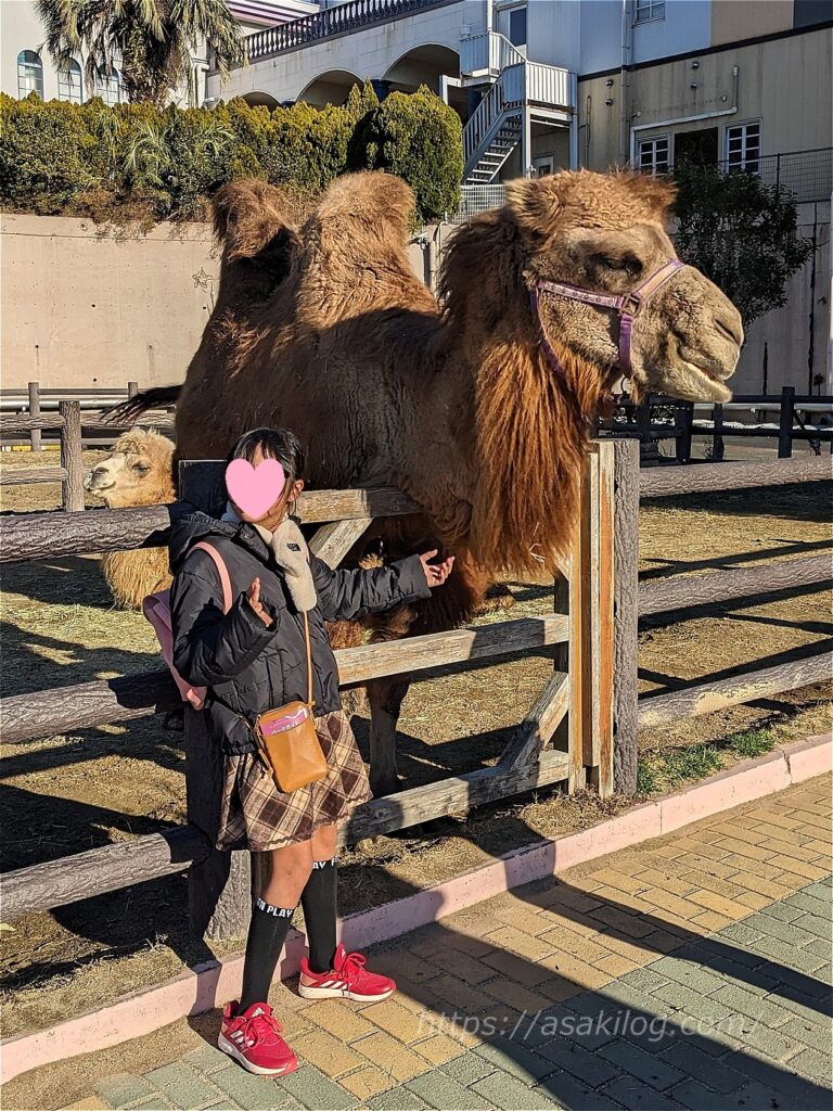 同じくファミリー広場の「フタコブラクダ」。背中に2つのコブがあるのが特徴です。飼育員さんが餌やりを終える頃に到着してバッドタイミング。娘と写真だけ撮影しました。