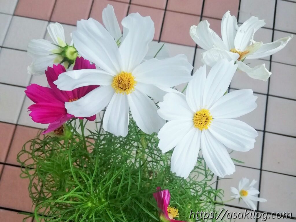 コスモスの植木鉢は、その後もたくさんのお花が咲きましたが、ミックス苗買ったはずなのに、白い花が多かった・・・何故?