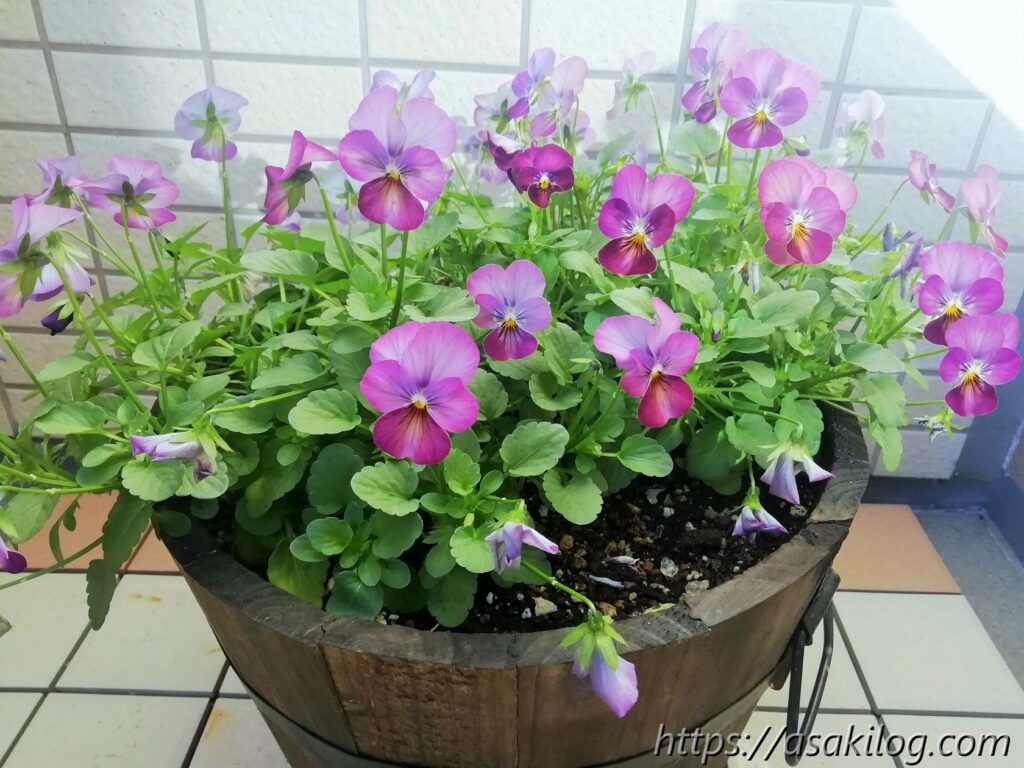 1か月後、もうたくさんのビオラが咲いています。ちなみに今回購入したビオラは「腕利きの生産者が選び育てた美しくて丈夫なビオラ」で、品種名は「ビオラ ももか こうめ」らしい。