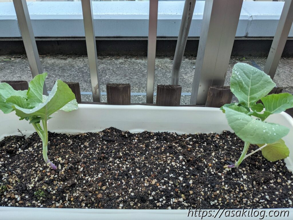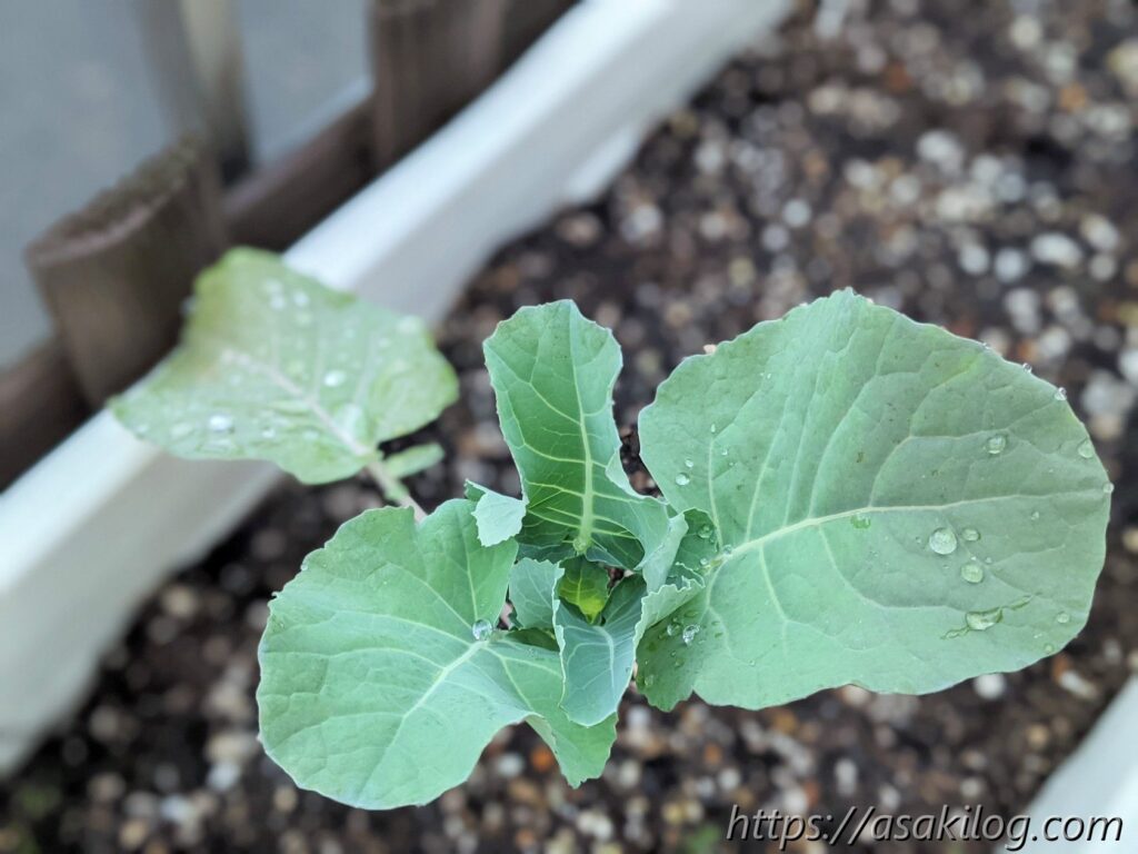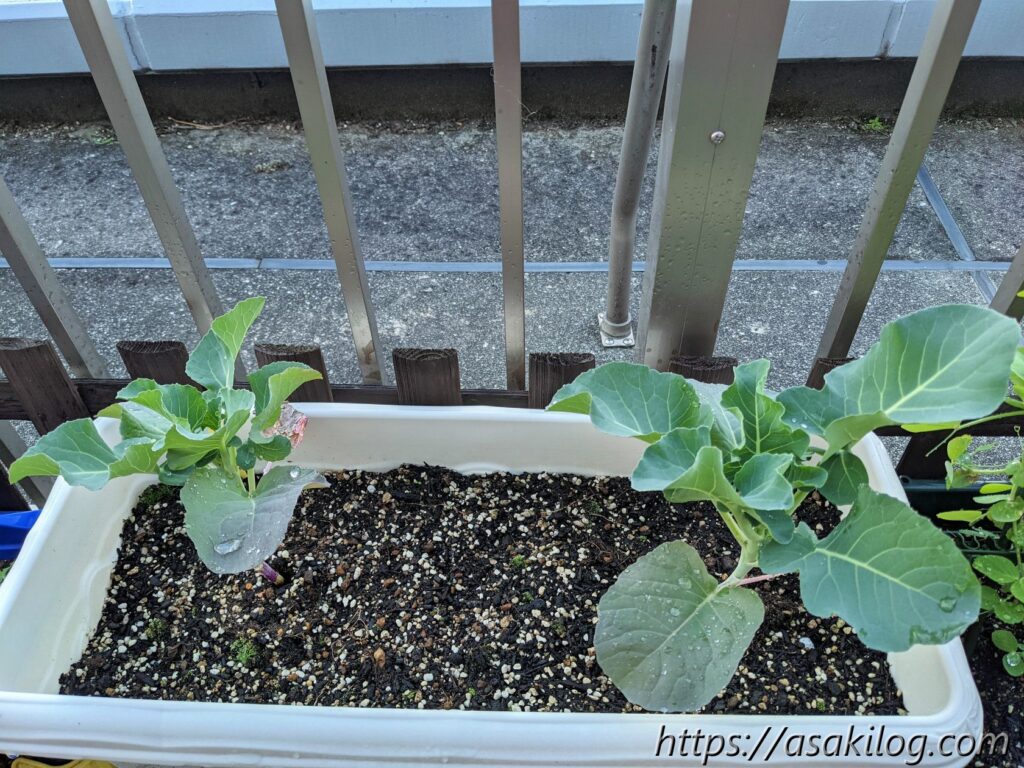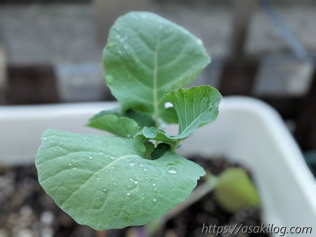 その日のうちに、プランターへ植えつけ。ブロッコリーってめっちゃ水を弾くんだよなぁ。