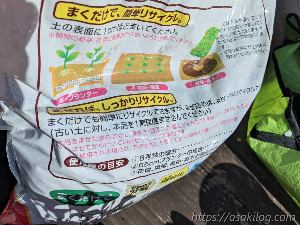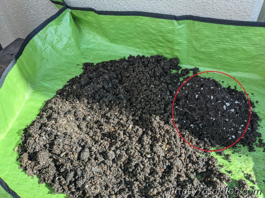 ちなみにいつも私は「自然応用科学 まくだけで甦る 土のリサイクル材 14L」を使用。古い土に1割程度混ぜ込んで使うだけなので便利ですよ(一番右側写真の赤○部分がリサイクル材)。