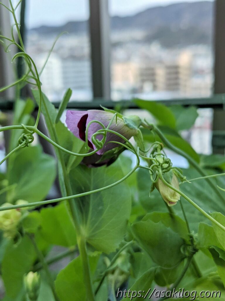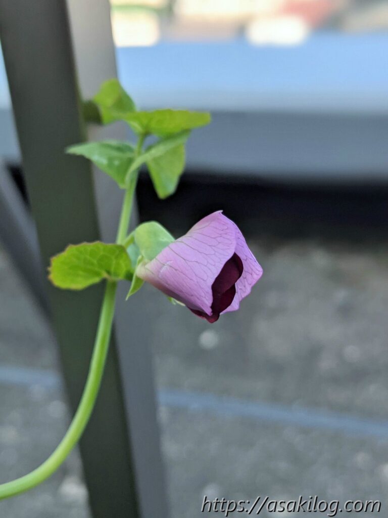 12/20、絹さやの蕾がピンクに着色。12/23、お花が咲きました。まじまじ見ると不思議な形やけど、この色合いは好きです。