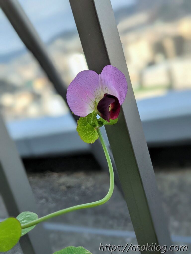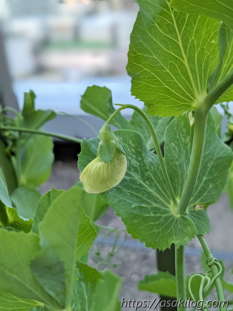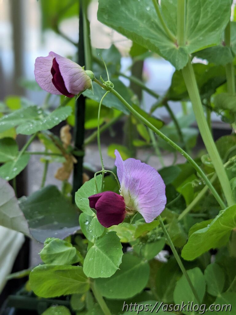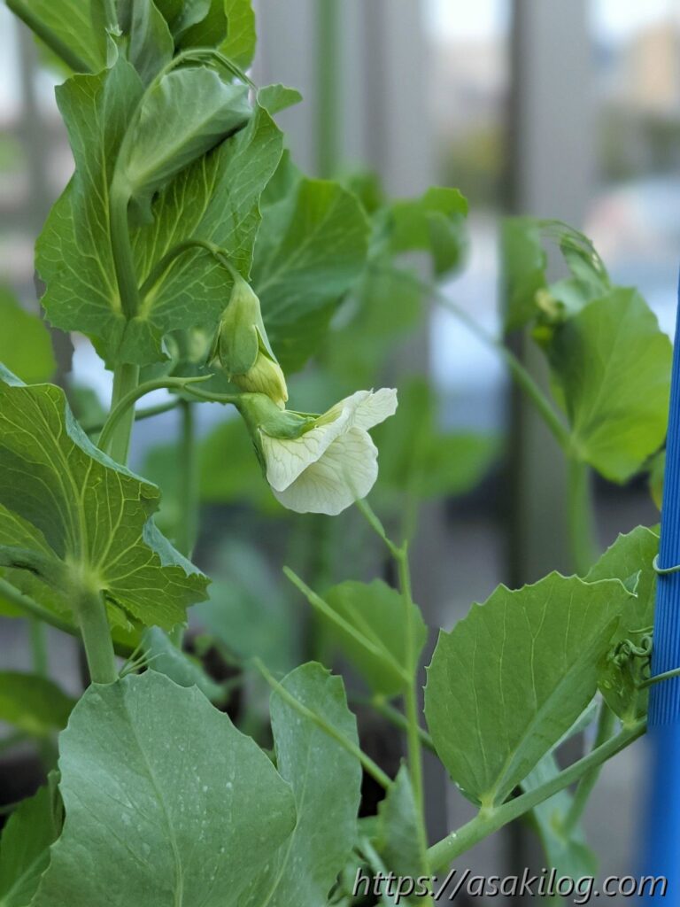 3/21、ようやくスナップエンドウの花が咲き始めました~。絹さやとは違った色合い。