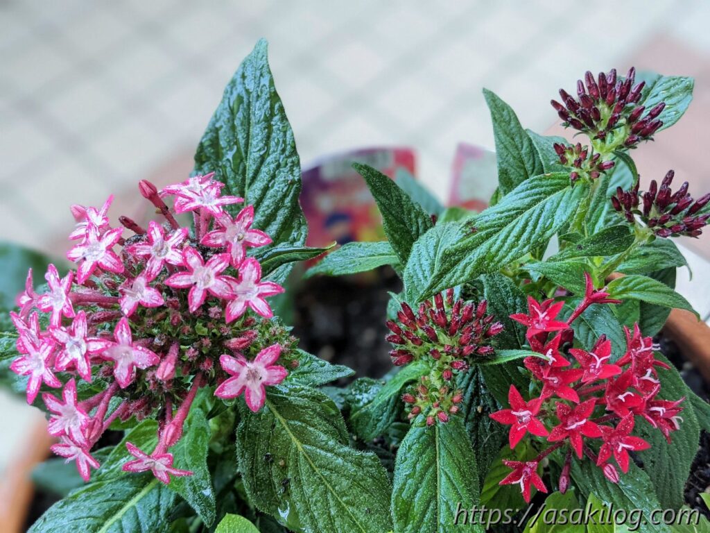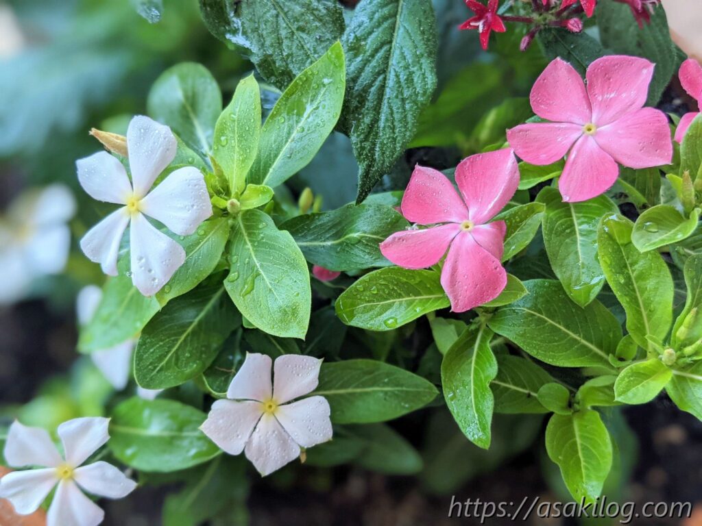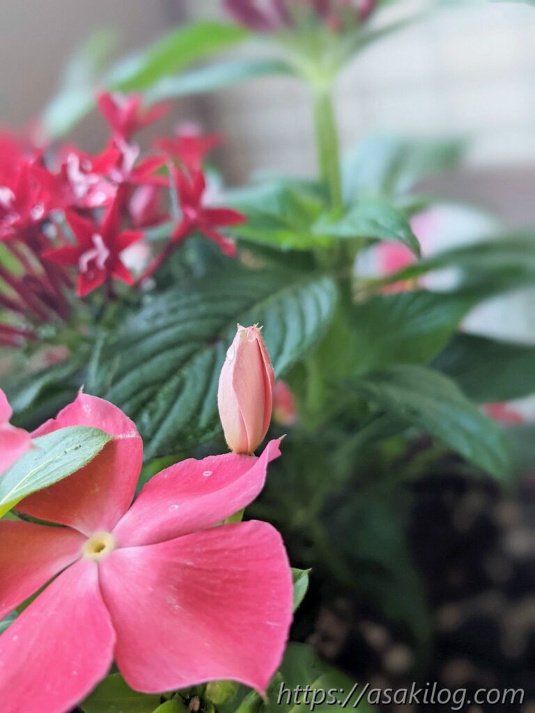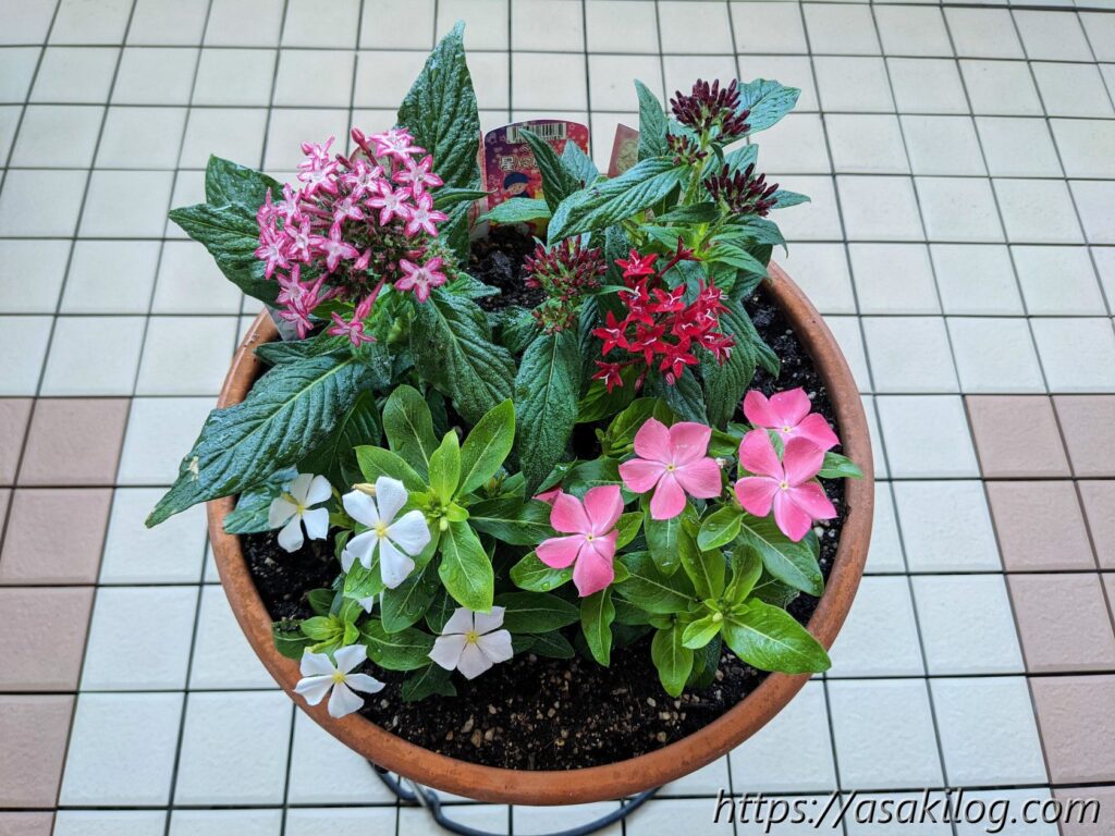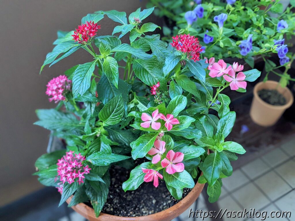 5月下旬に「ペンタス(ピンク、赤)」「ニチニチソウ(紅ざくら、さくらミルク)」の4つの苗を購入しました。