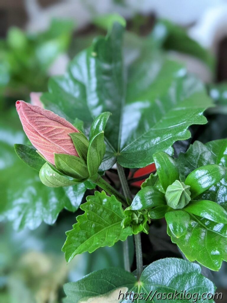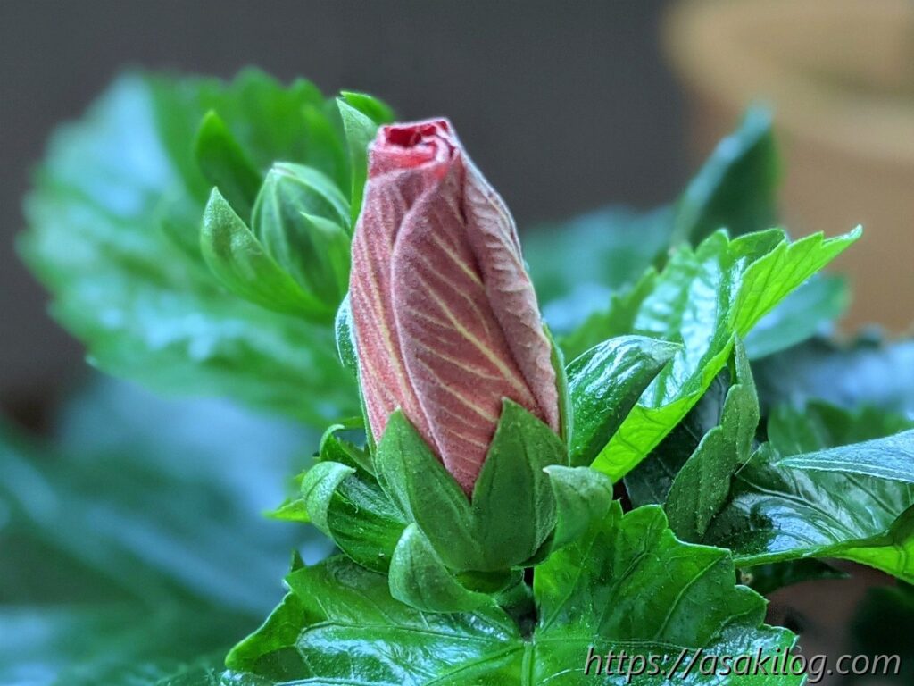 6月4日、ハイビスカスの蕾が赤く色付いてきました。もうすぐ咲くかな?