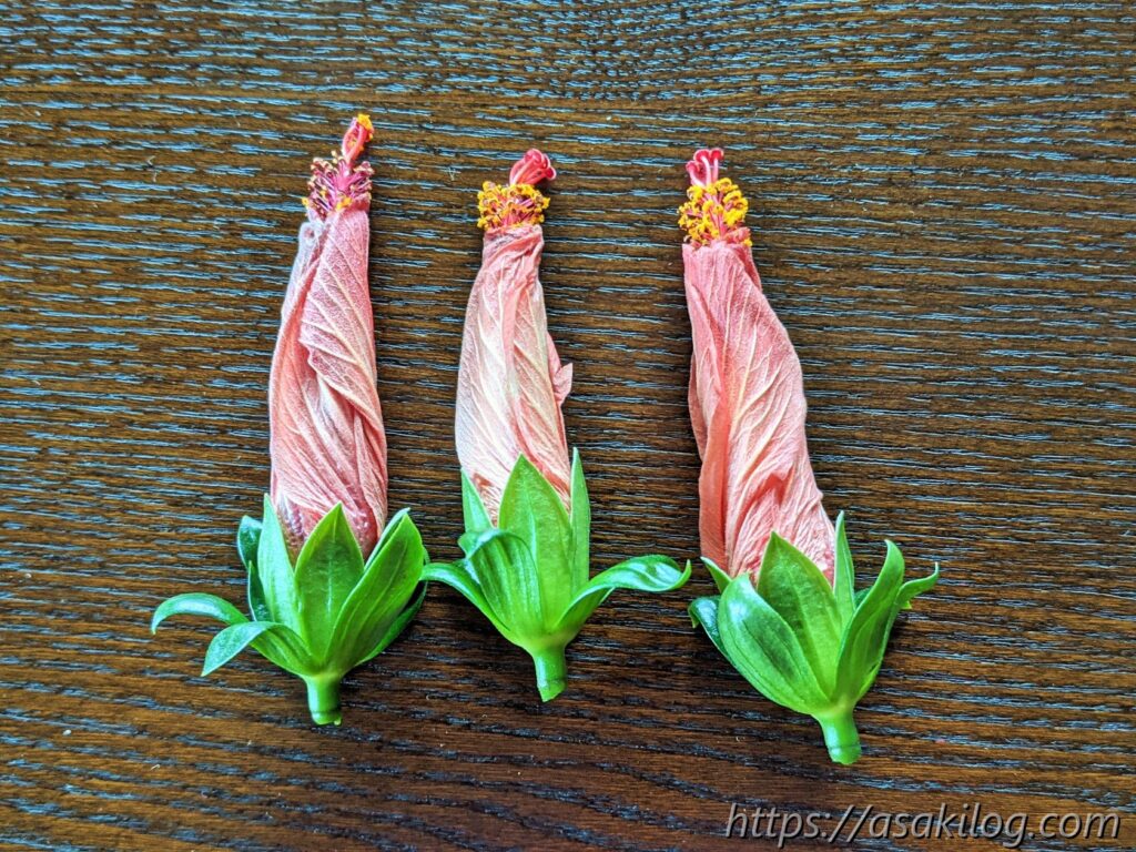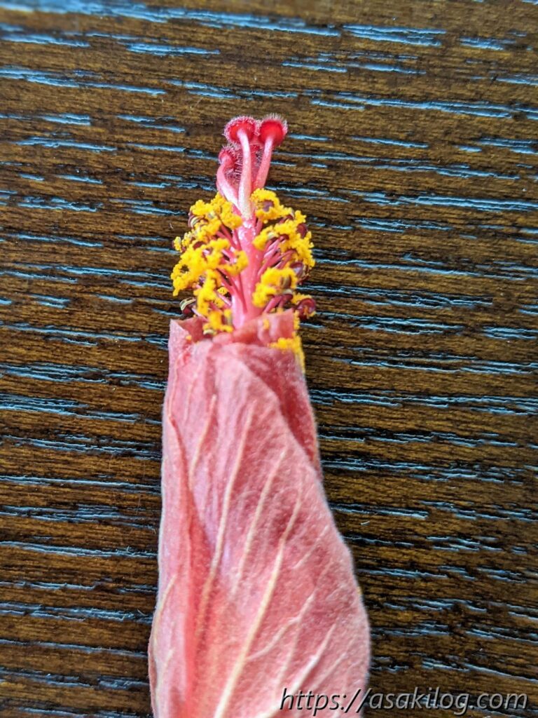 ハイビスカスの「蕾」と咲き終えた後の「花がら」って、ちょっと似てて。蕾はしっかり花が閉じてるけど、花がらは閉じた花から雄しべがはみ出ています。