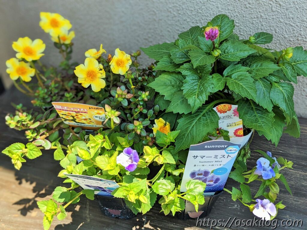 6月に入ってから購入したのが、左奥の「夏チュラカ(イエローストライプ)」、右奥の「ダリア(ディアマンテ)」、手前の2つ「サマーミスト(ブルー)」です。