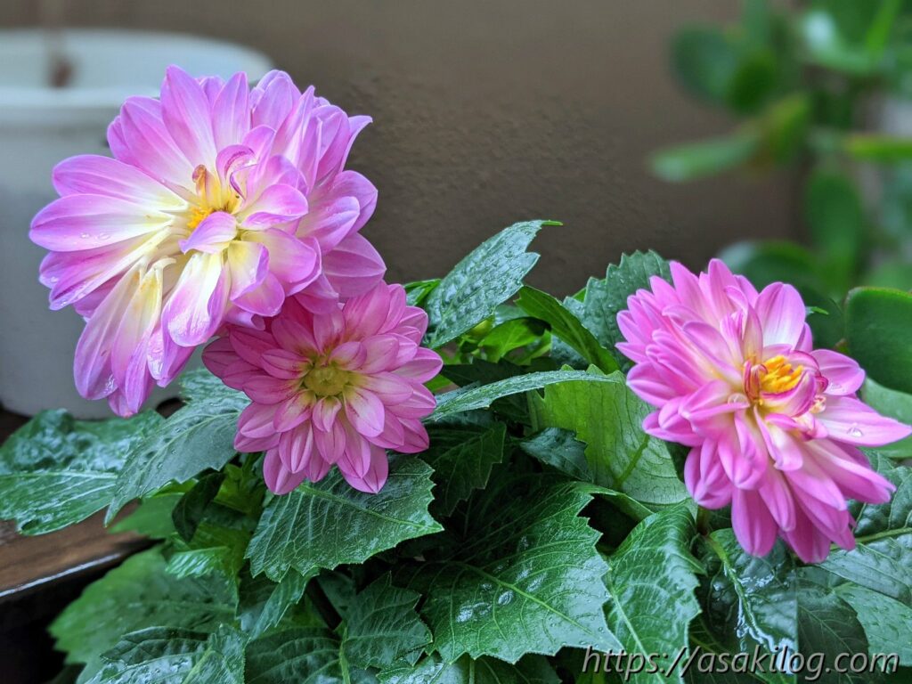 6月半ばには2つめのお花が咲き(左側が1つ目、右側が2つ目)、そしてまたすぐ3つ目のお花(真ん中)も咲きました。1つ目のダリアの花は途中で崩れてきましたが、かなり長い間咲いてくれたのが嬉しい。
