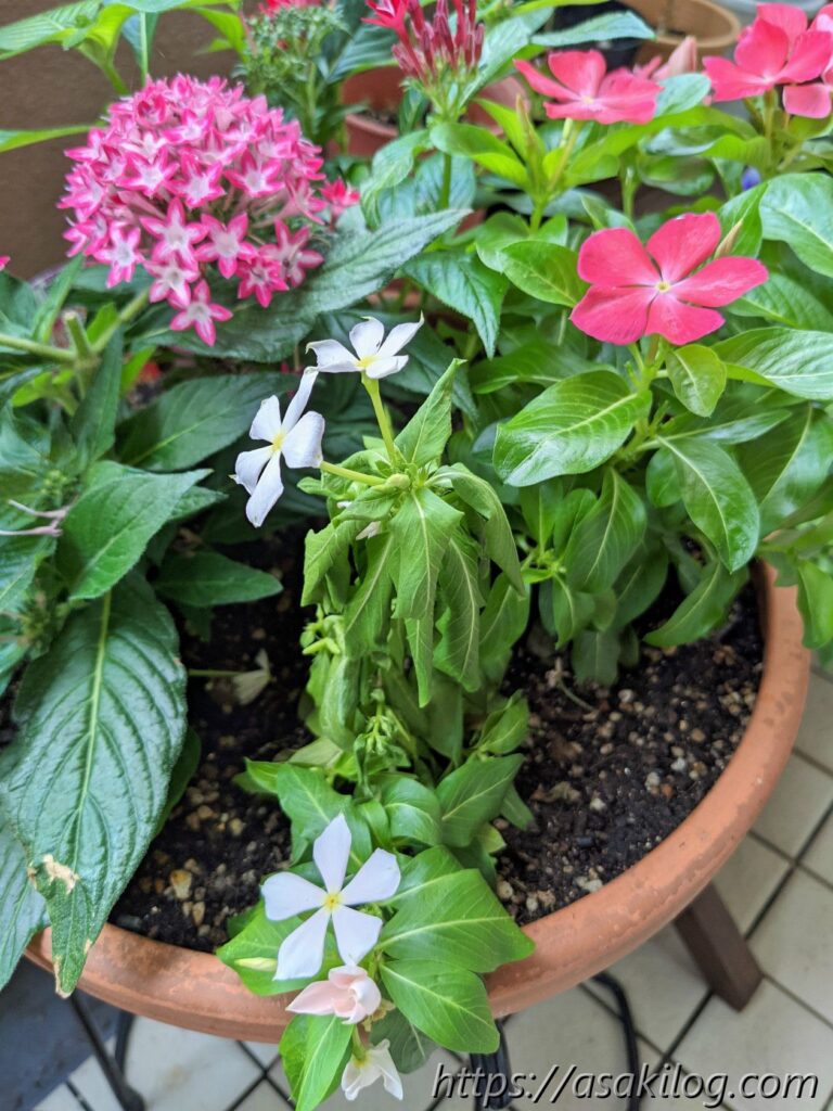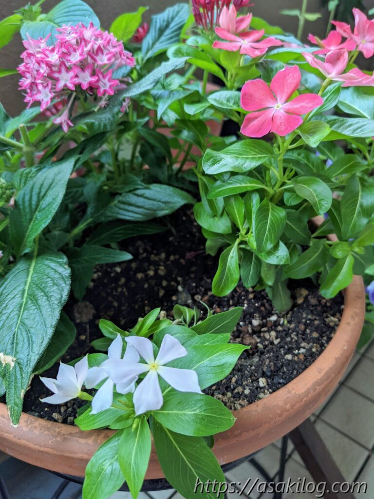 今シーズンの寄せ植え鉢の反省点は、おそらく苗を入れすぎたことでしょうか?欲張りな性格なので、つい4苗も入れてしまいましたが、結局はニチニチソウ(さくらミルク)が枯れてしまい、ペンタスは赤だけやけに大きく育ち、ピンクはこじんまりとしたまま。来年は余裕をもって3苗または2苗で挑戦したいと思います。
