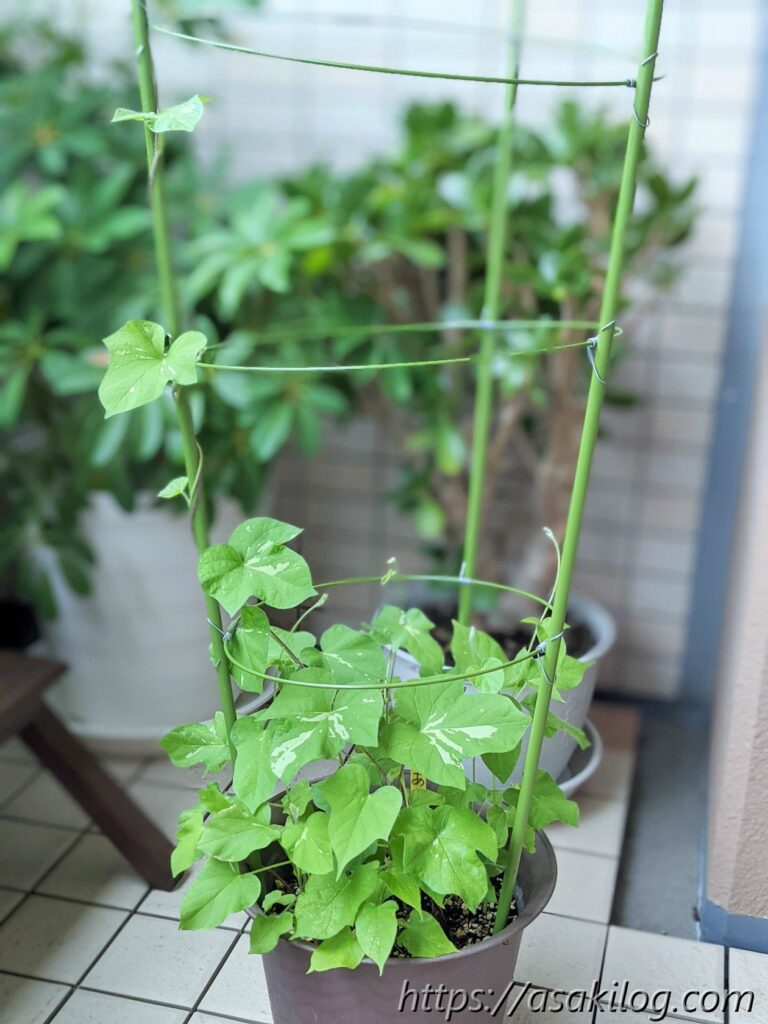 6月5日、だいぶ葉も増え、先を見越して支柱を設置しました。
