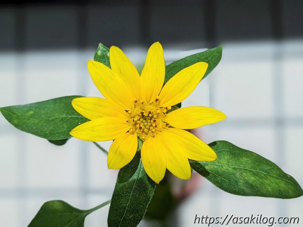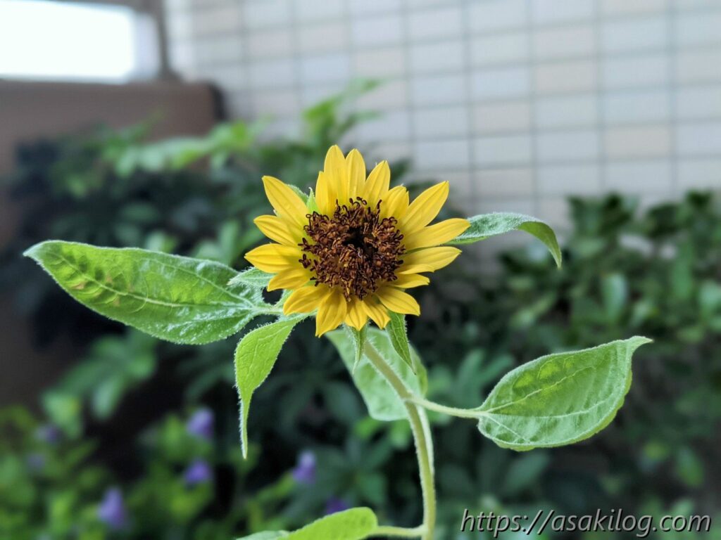 7月15日、ついにベランダのひまわりが咲きました。直径5cmくらいの小さな花ですが、それはそれで可愛い。植木鉢片手に、どこで写真撮ろうか?家の中をウロウロ。