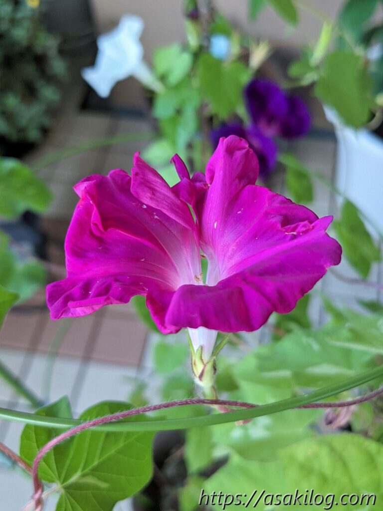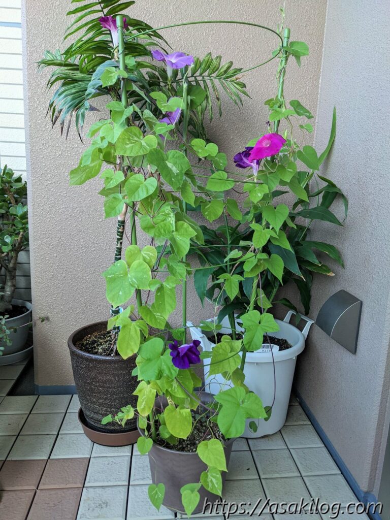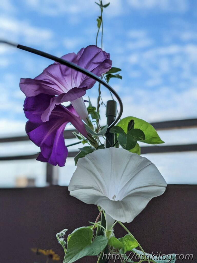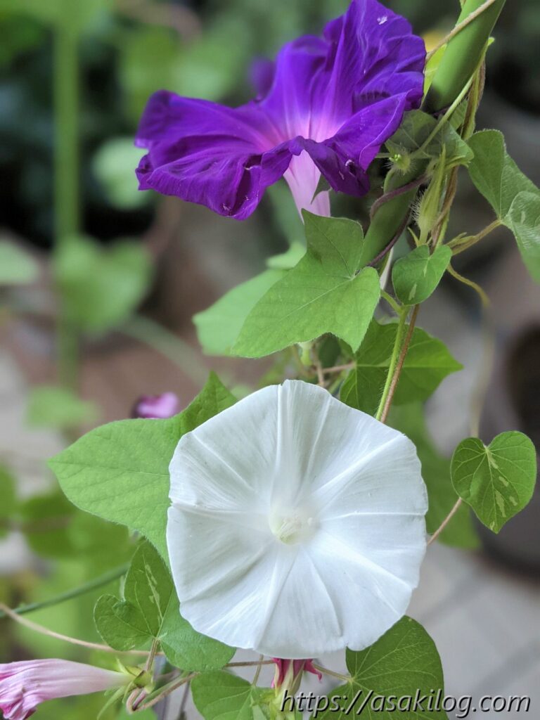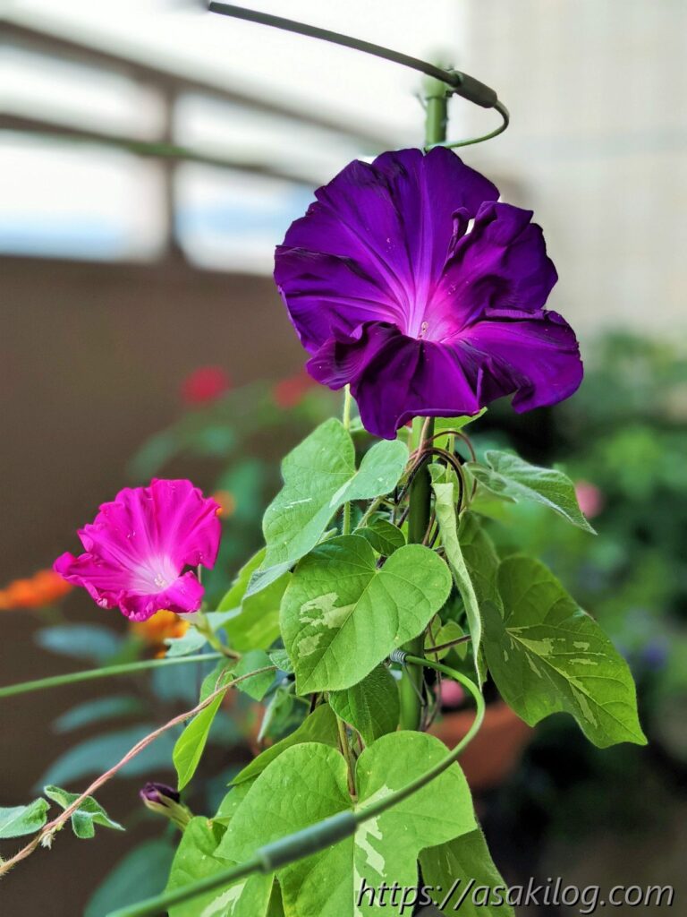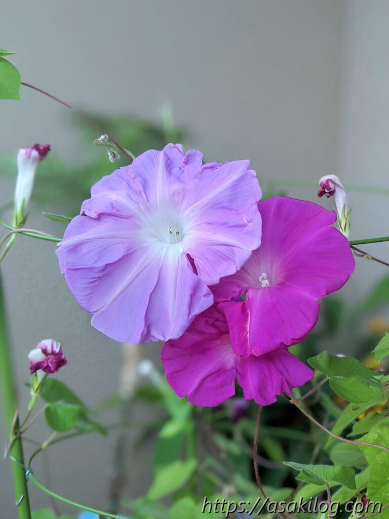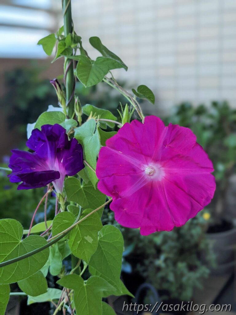 7月31日には、紫色とピンク色の2つの朝顔が咲いてます。