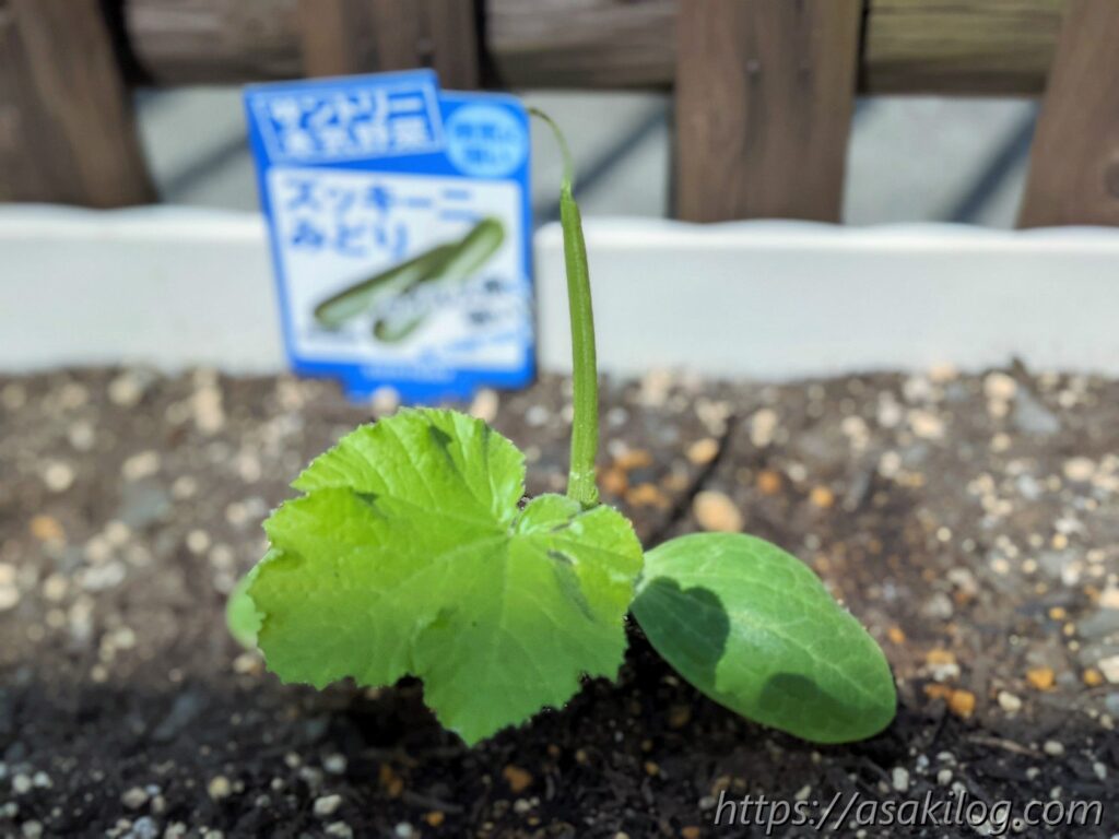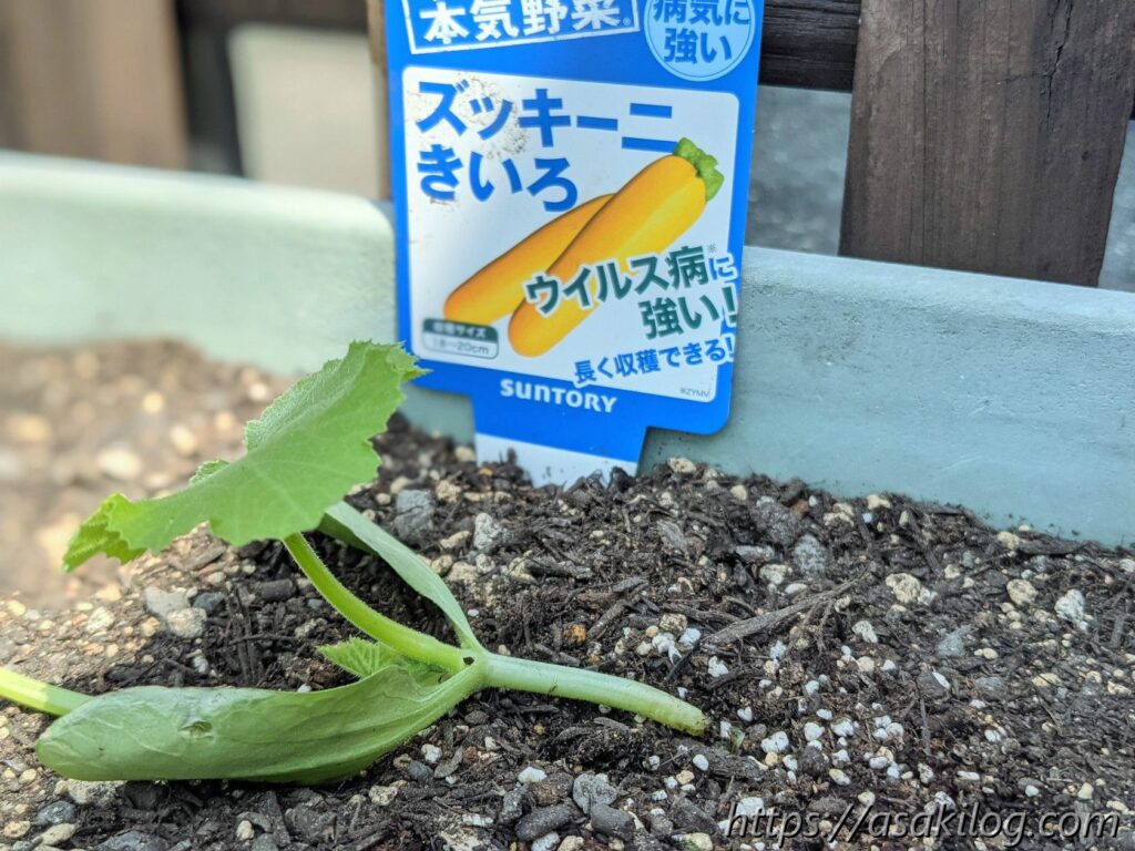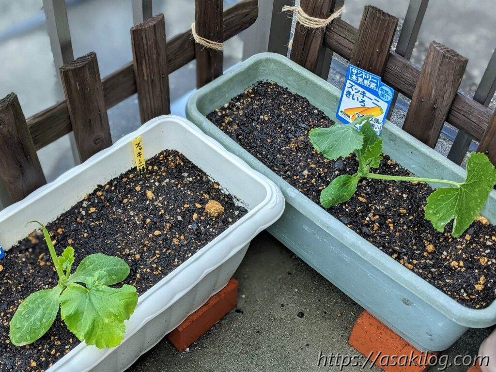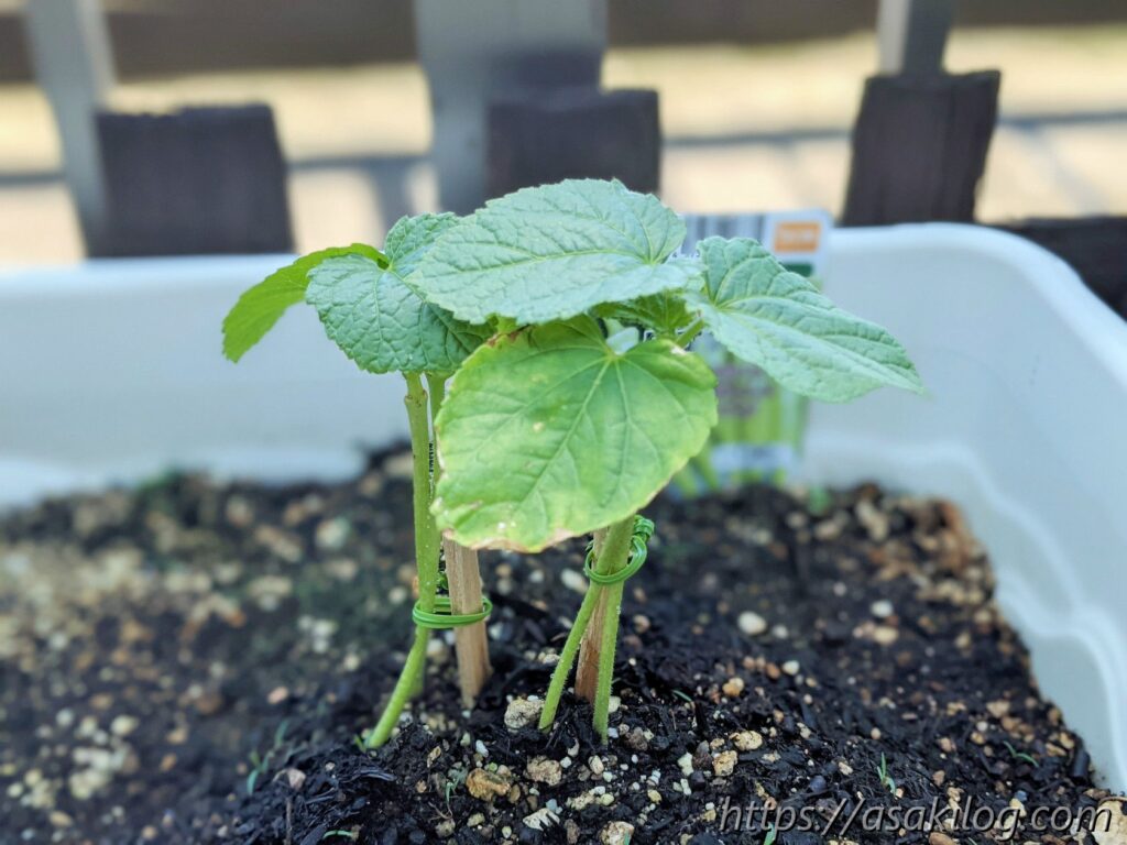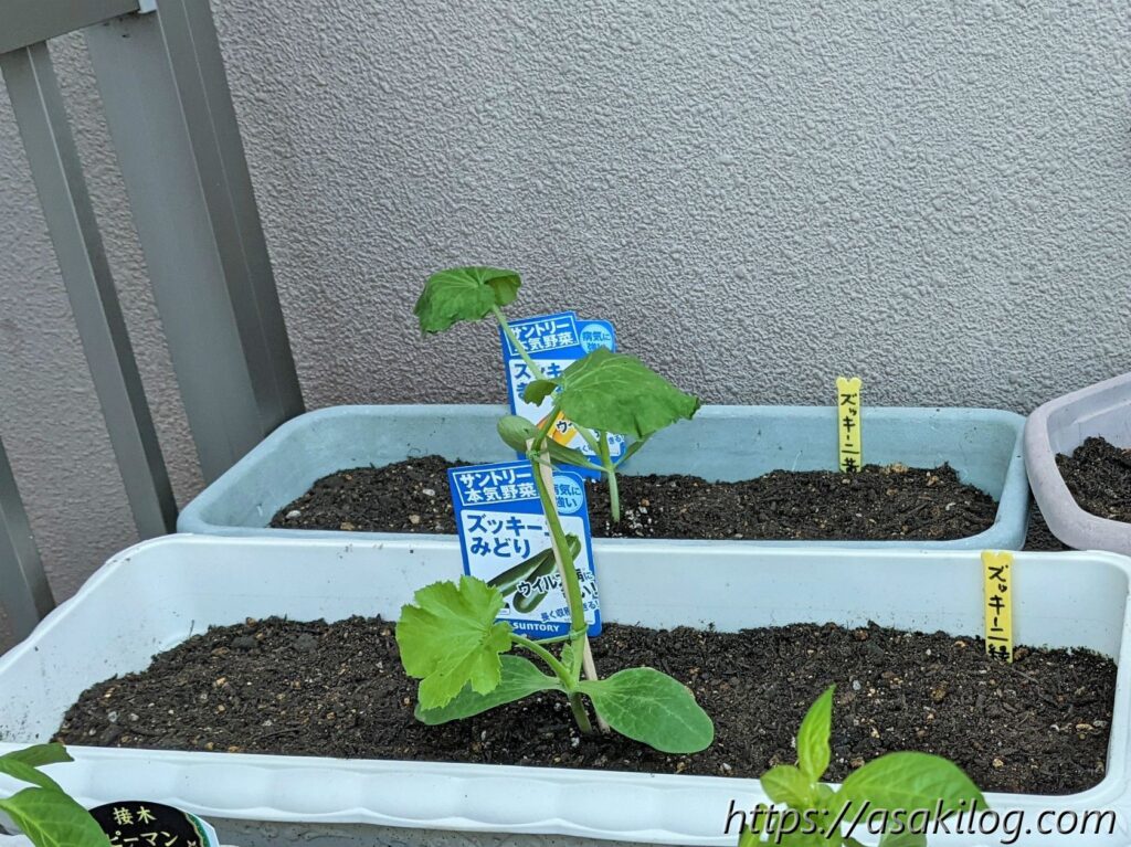 ツイッターのフォロワーさんから「ズッキーニはうまく育つと大きくなり場所をとる可能性がある」と聞いたため、ひとまず1つのプランターに1苗植え付けることに。風が強かったせいか?茎が折れ曲がってしまい、試しに割りばしで補強しました。
