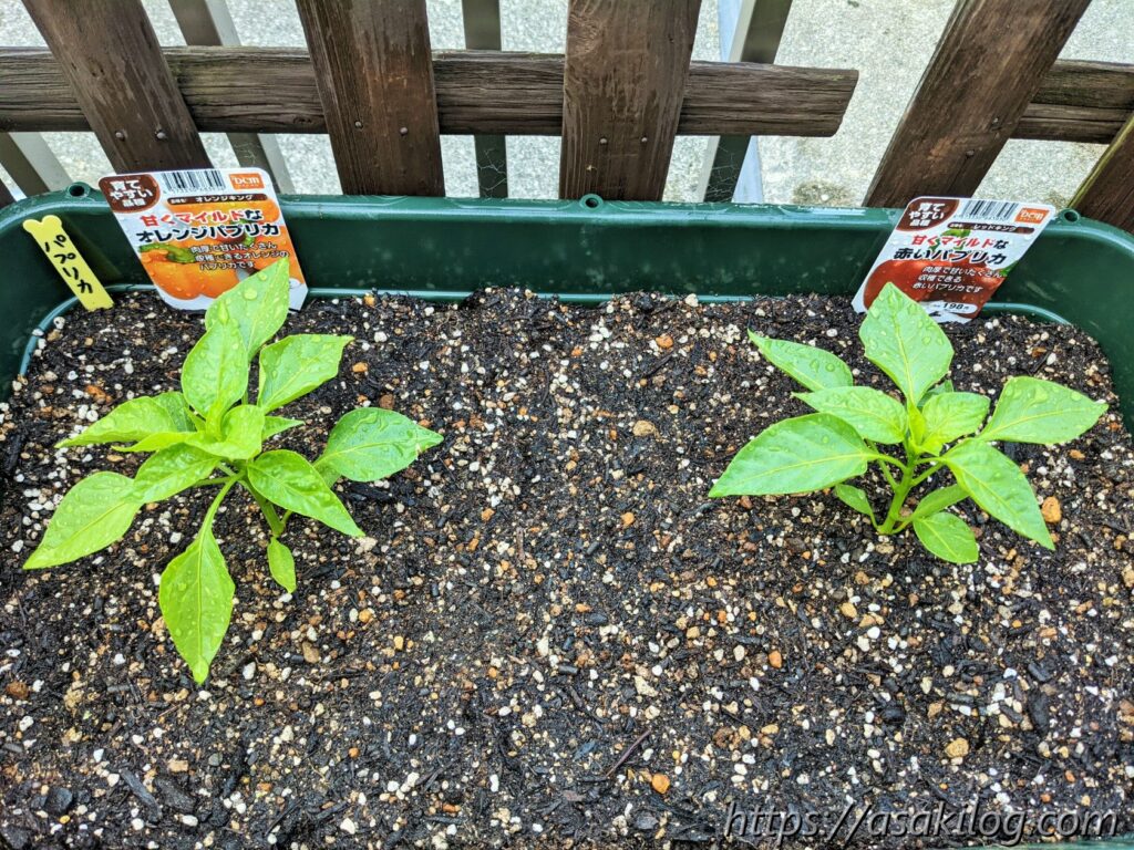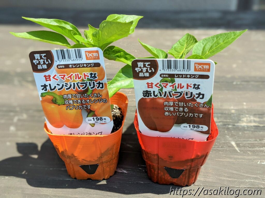 実がついてから、色付いて収穫できるまでに時間がかかるパプリカ。今シーズンも育てようか?悩みつつも、去年オレンジ色のパプリカを育てたかったことを思い出し、4月下旬にオレンジと赤の2つの苗を購入しました。