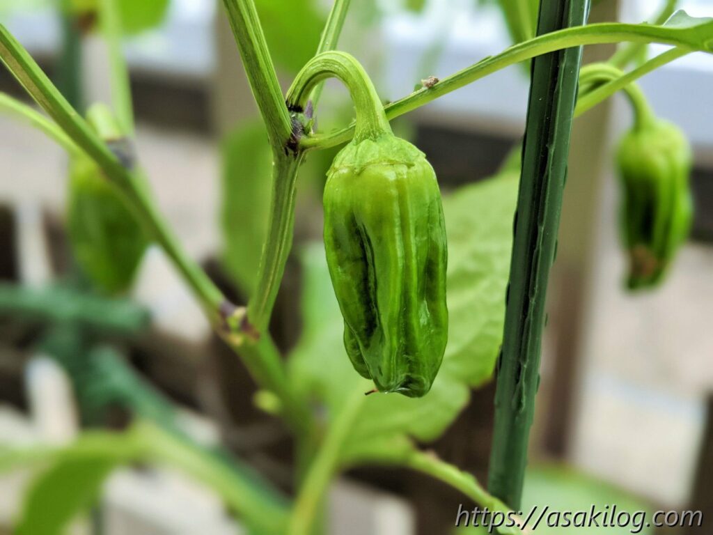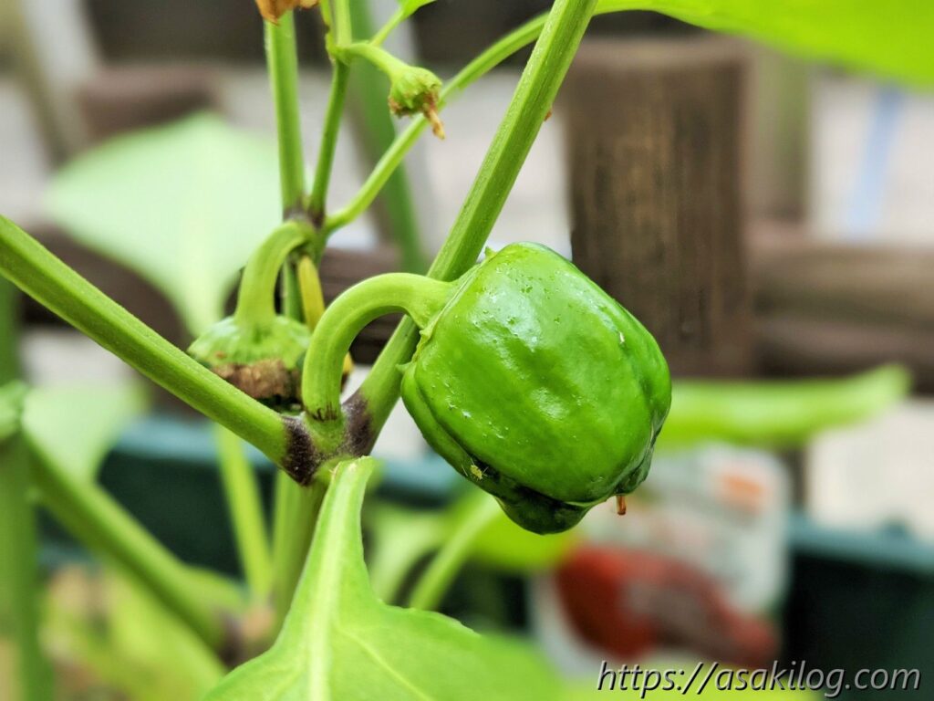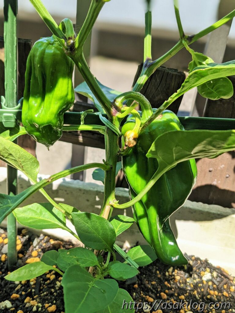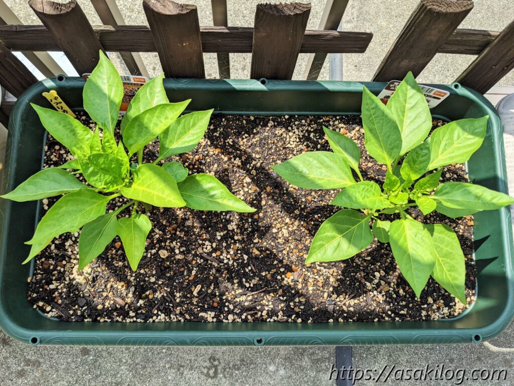 ピーマンはもう毎シーズン育てています。私的には使いたい時にその都度収穫できる便利なお野菜。4月下旬に京みどりを2苗購入しました。