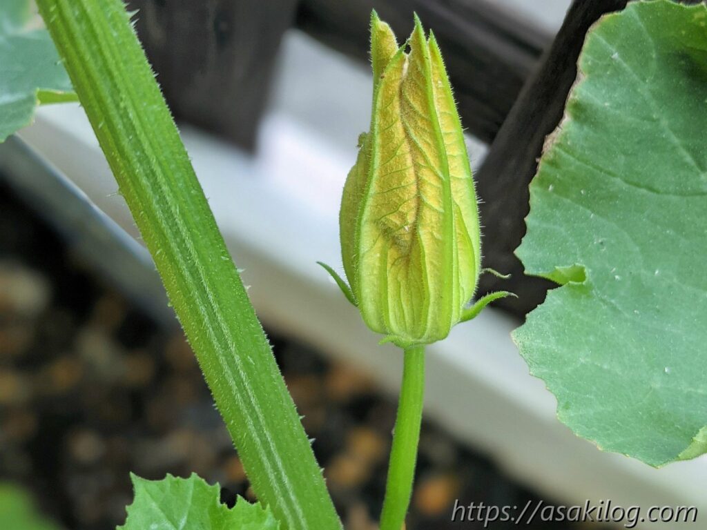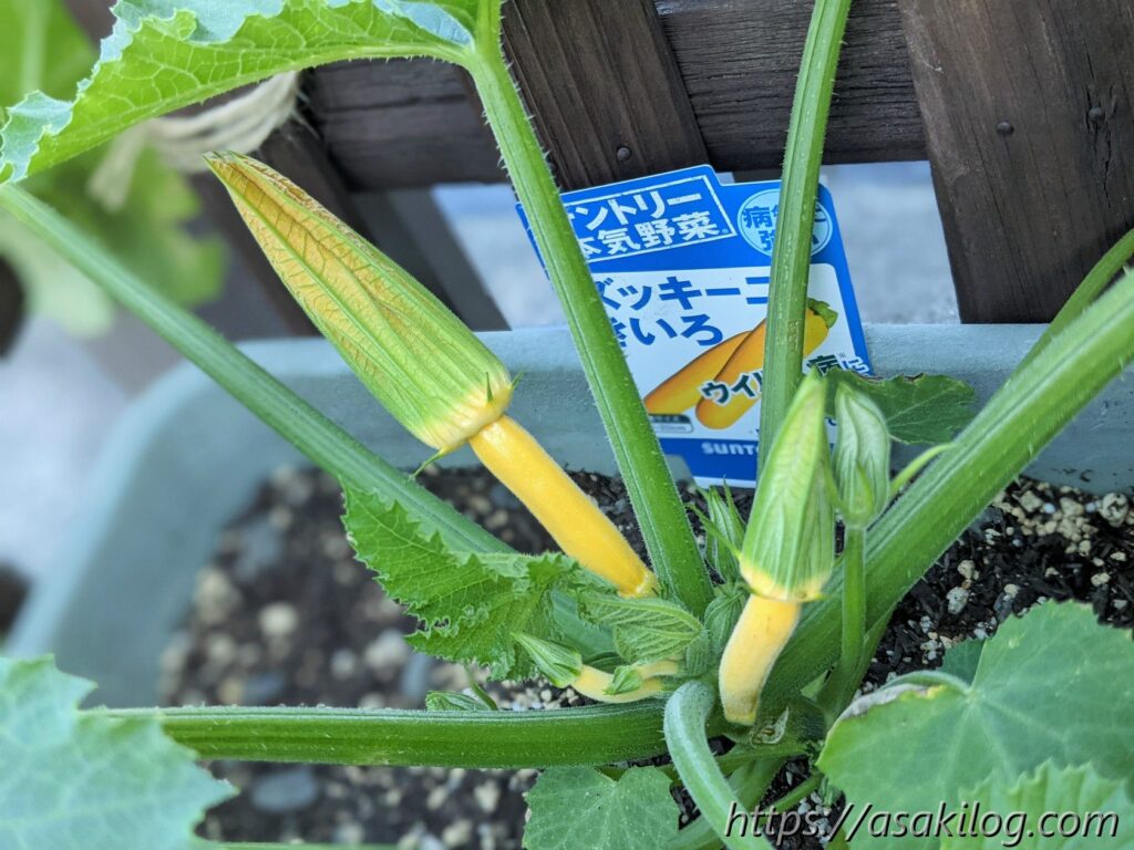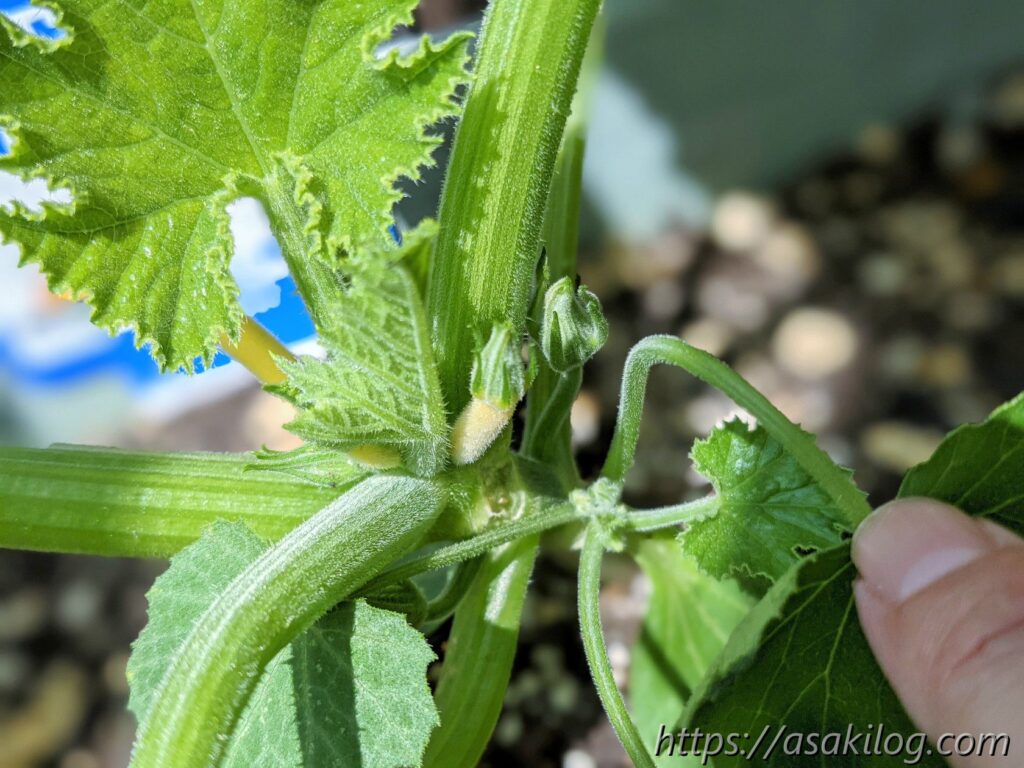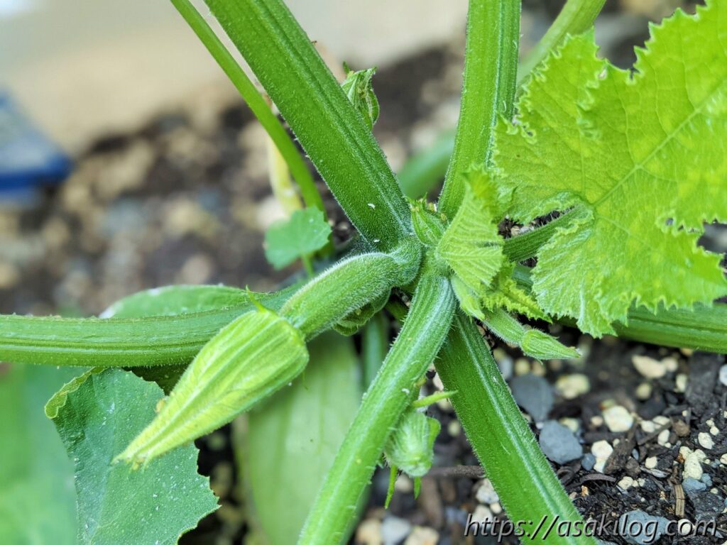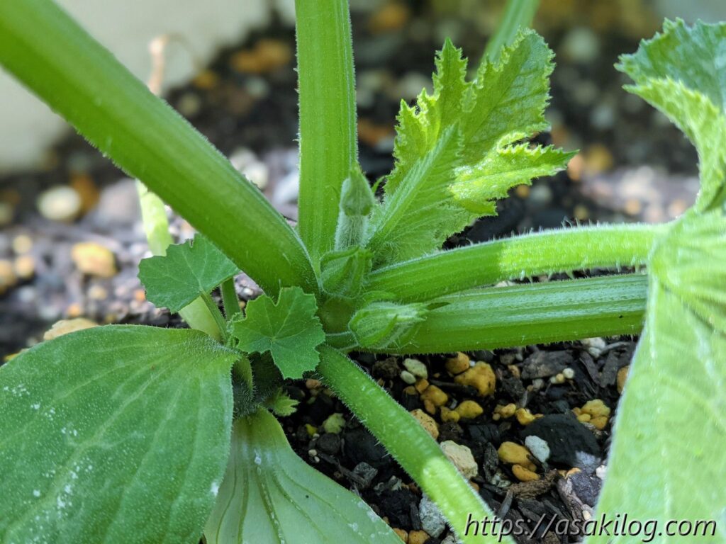 ちなみに今回3本続けて摘花したのはズッキーニの雌花の方で、雄花はまだ小さく咲いてません。実はズッキーニは「受粉をしないと実が大きくならない」らしく、できれば人工授粉した方が良さそう。人工授粉のためには、雄花雌花両方の花が同じタイミングで咲く必要があります(参考:ズッキーニの育て方 ~受粉編~)