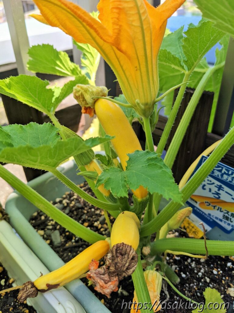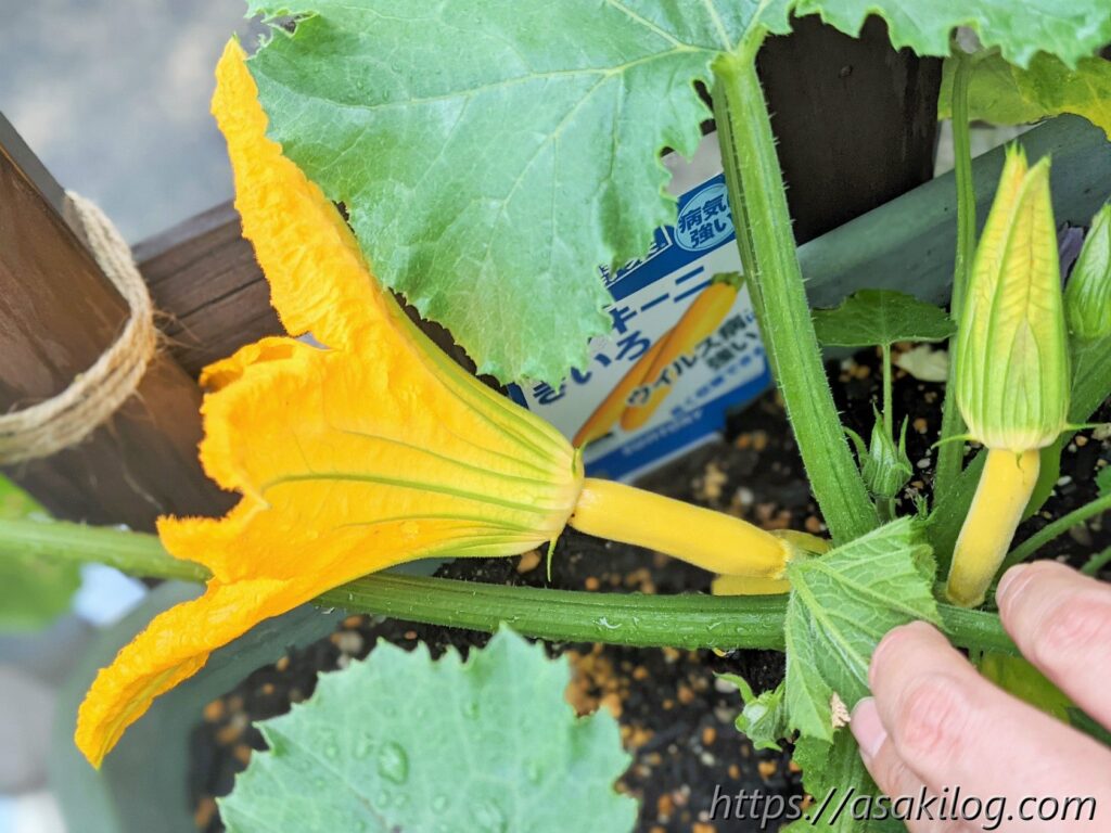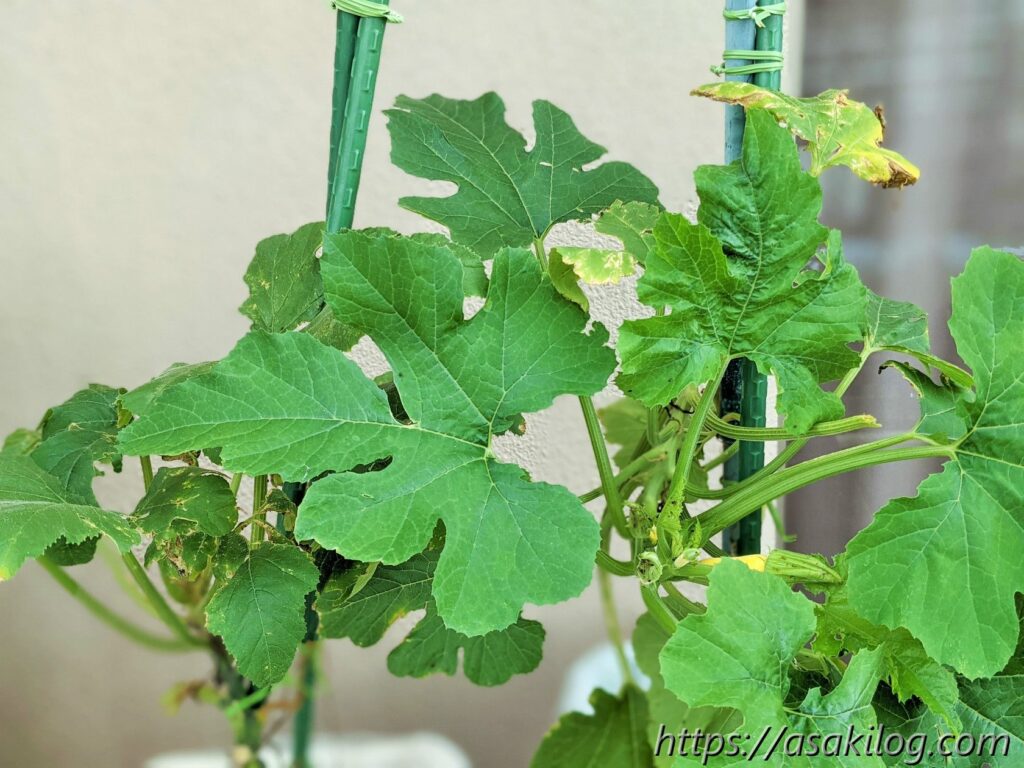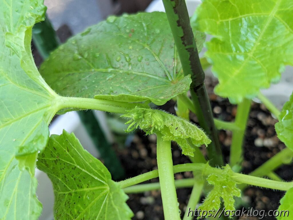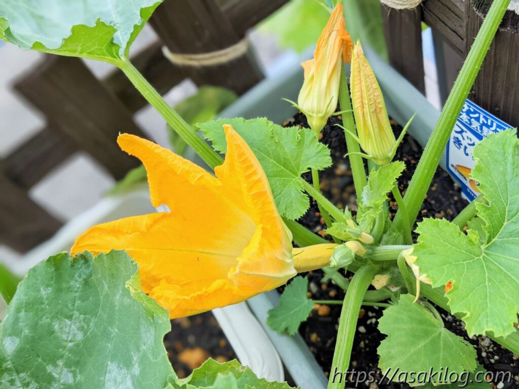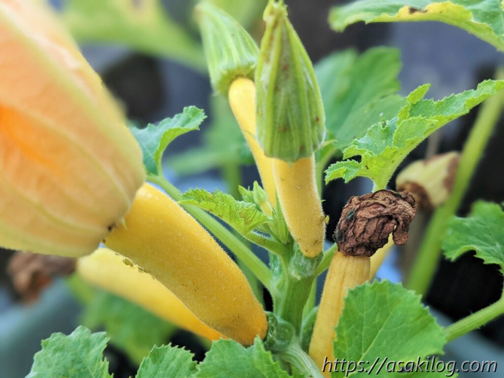 ちなみに今回3本続けて摘花したのはズッキーニの雌花の方で、雄花はまだ小さく咲いてません。実はズッキーニは「受粉をしないと実が大きくならない」らしく、できれば人工授粉した方が良さそう。人工授粉のためには、雄花雌花両方の花が同じタイミングで咲く必要があります(参考:ズッキーニの育て方 ~受粉編~)