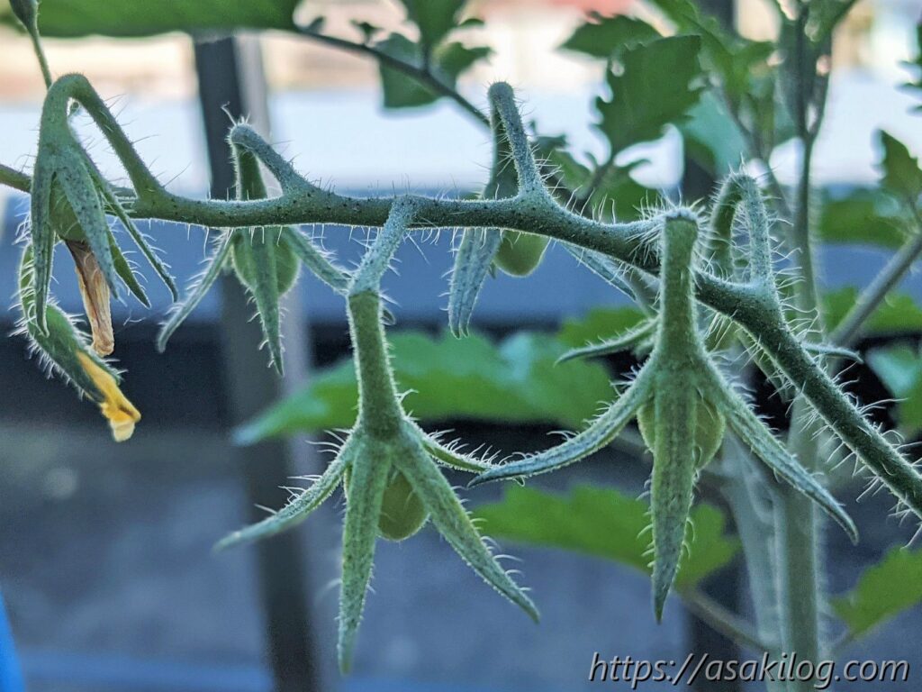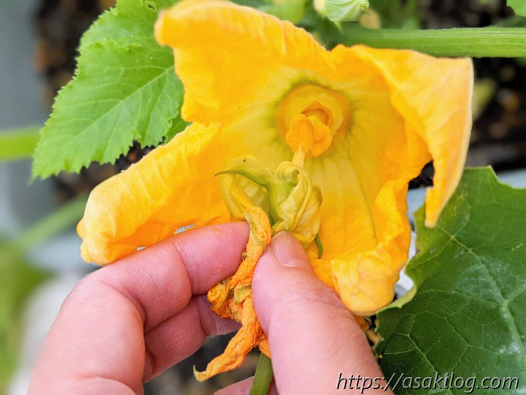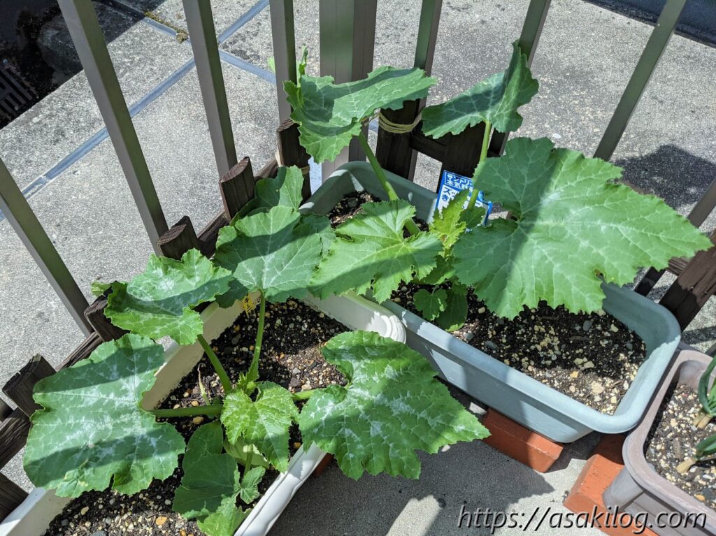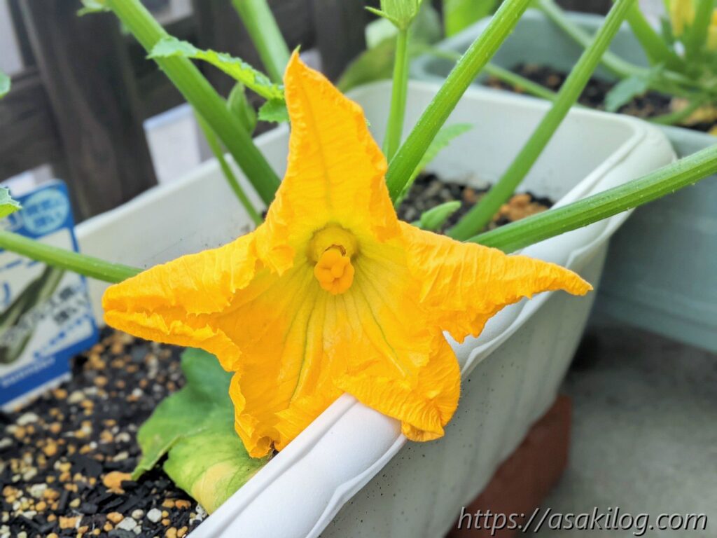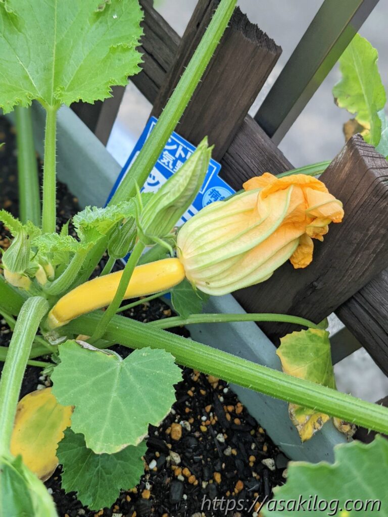 ちなみに今回3本続けて摘花したのはズッキーニの雌花の方で、雄花はまだ小さく咲いてません。実はズッキーニは「受粉をしないと実が大きくならない」らしく、できれば人工授粉した方が良さそう。人工授粉のためには、雄花雌花両方の花が同じタイミングで咲く必要があります(参考:ズッキーニの育て方 ~受粉編~)