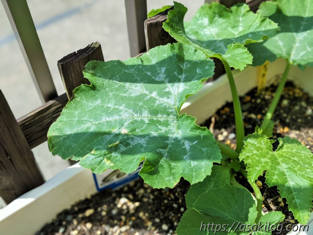 5月9日、ぐんぐん大きく育っているズッキーニ。ちょうど葉っぱに白っぽい模様ができていて「まさか、うどんこ病?!」と調べてみたら、どうやら葉っぱの裏には模様ができてないから違うみたい(参考サイト:ズッキーニの模様と うどんこ病の違い 原因と対策)
