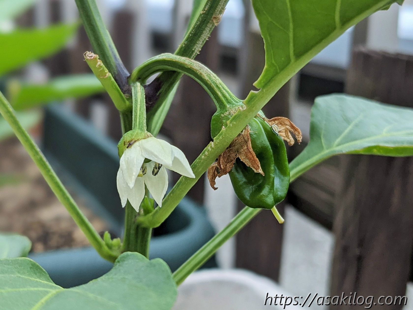 5月10日、白い花と小さい実ができています。まだ小さいけど、もうすっかりピーマンの姿。