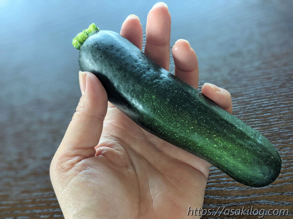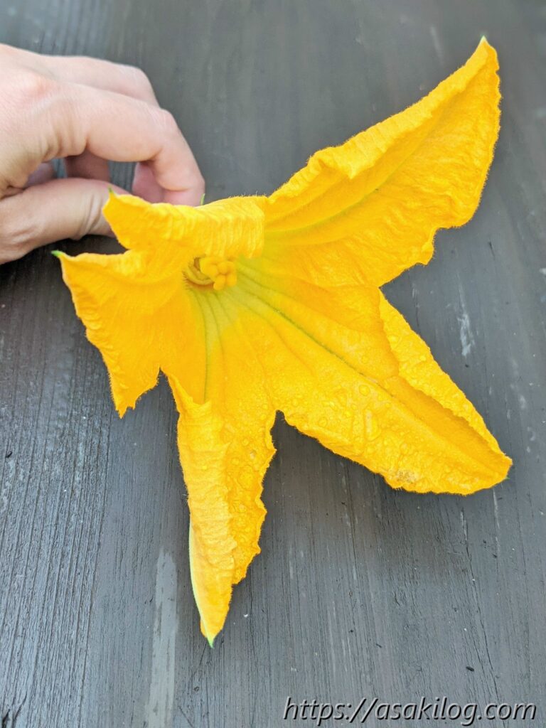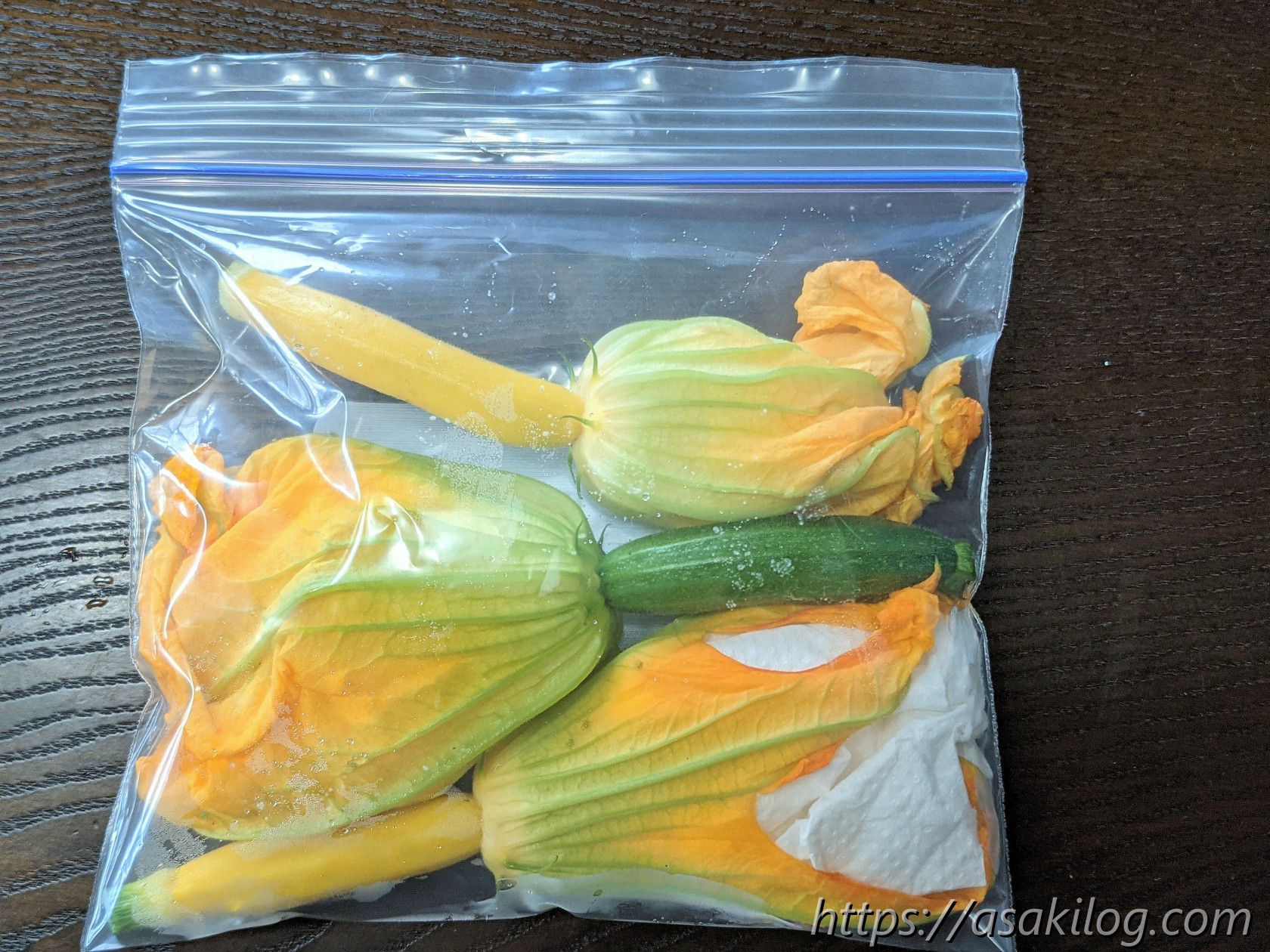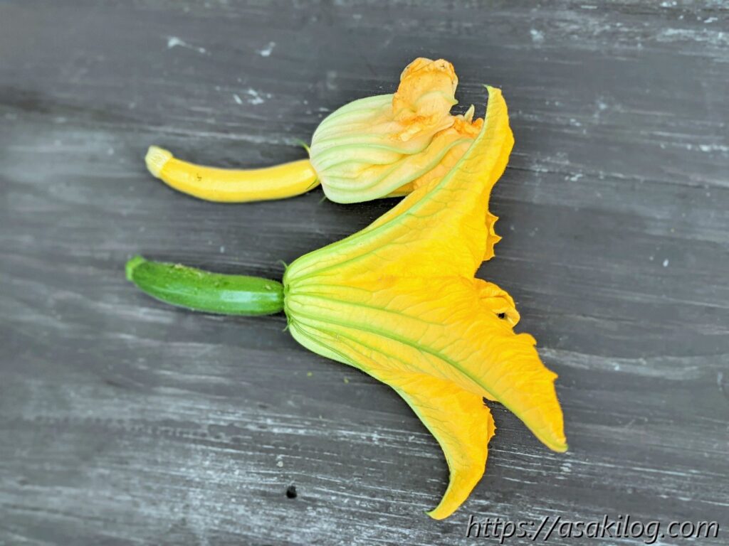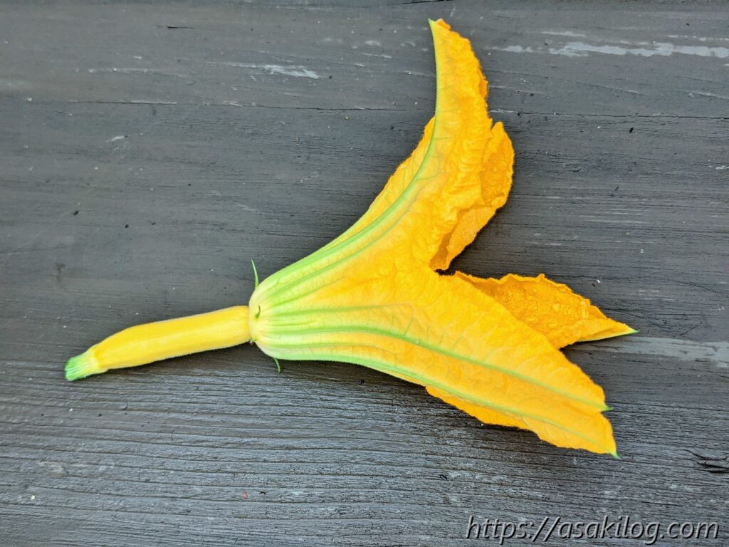 ちなみに花ズッキーニは食べられるそう。この時点での収穫は1つだけだったので、とりあえずネット情報を参考に、花の中にキッチンペーパー詰める→ジップロックに入れる→冷蔵庫の野菜室で保管しました。