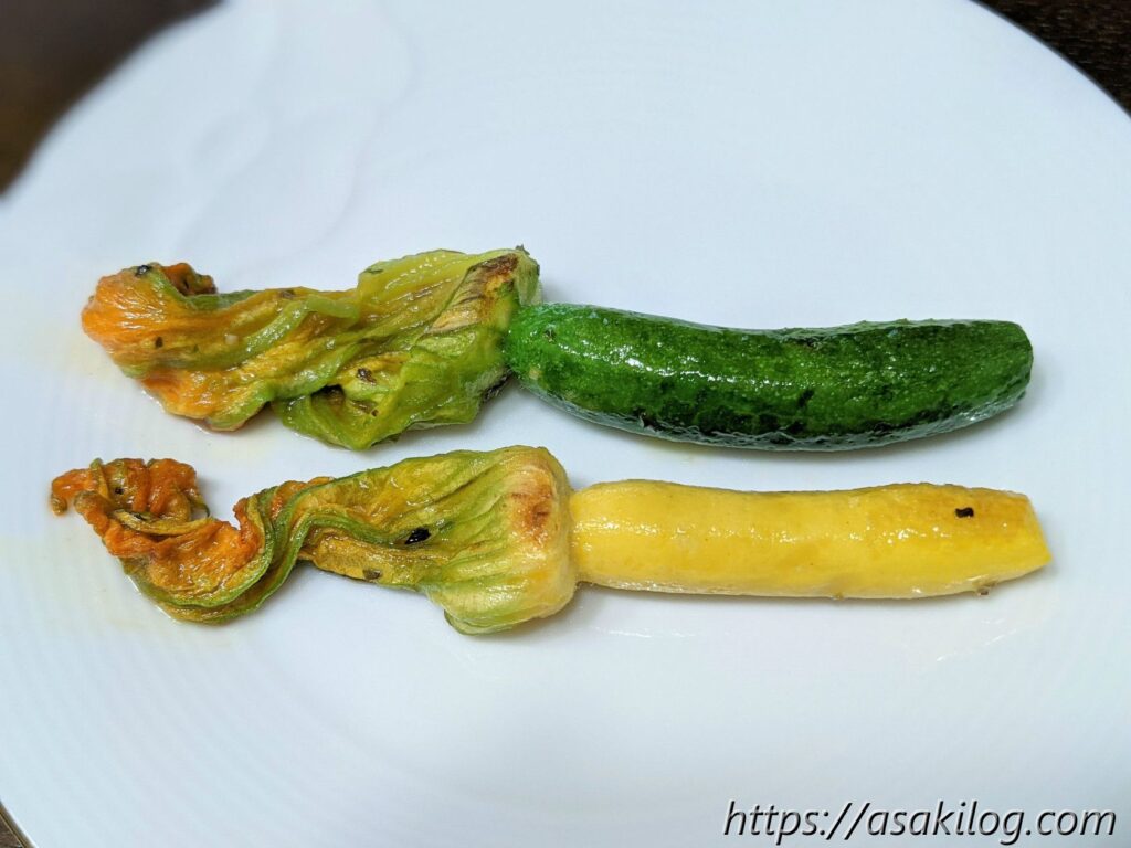 本場イタリアでは、花ズッキーニをフリットとして食べるのが有名らしいけど、我が家では天ぷらを揚げない主義なので、オリーブオイルとハーブソルトでソテーして頂きました。花ズッキーニの味は、ちょっと遠くでカボチャを感じるような?でもズッキーニのような? 花の部分はだいぶ縮んで、めっちゃハーブソルト味でした。ひとまずズッキーニの摘花はこれにておしまいです。