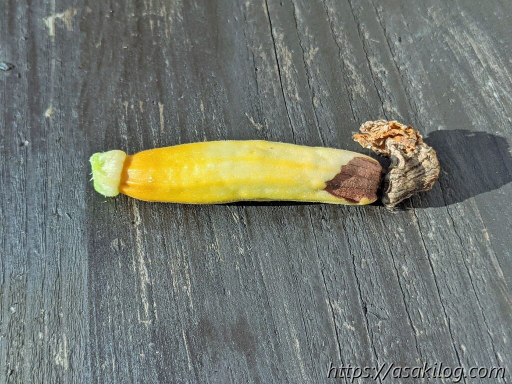 6月1日、人工授粉に初挑戦してから10日経過。人工授粉に成功していれば、開花後1週間くらいで収穫のはず!ですが、一番最初に人工授粉した黄ズッキーニは成長しておらず。元気が無くシナシナした感じなので、諦めて切り落としました。その後人工授粉した緑ズッキーニだけは13cmくらいまで大きく育ちツヤツヤキラキラです。