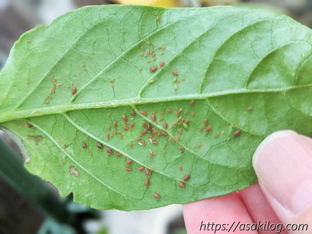 6月上旬、「今年は虫にやられなくてラッキー」と思っていましたが、それは気のせいでした。ついに今シーズンもこの気持ち悪い虫たちが葉っぱの裏にビッシリ。これまでの経験上、一番効果的なのはガムテです(ぺたぺたして取るだけ!)