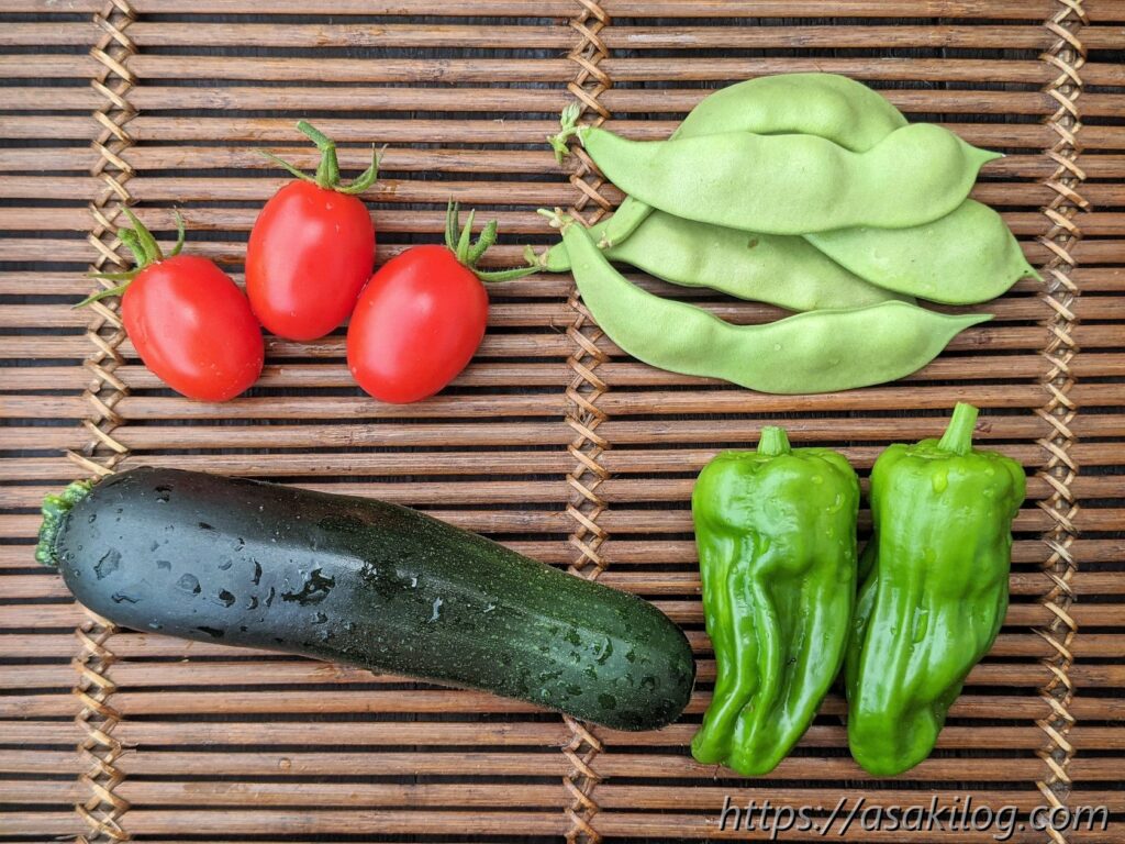 4月半ばにまとめて購入した苗が「プチトマト(アイコ)、ズッキーニ(緑+黄色)、ピーマン(京みどり)、ツルありモロッコいんげん豆」です。ズッキーニを育てるのは今年が初!