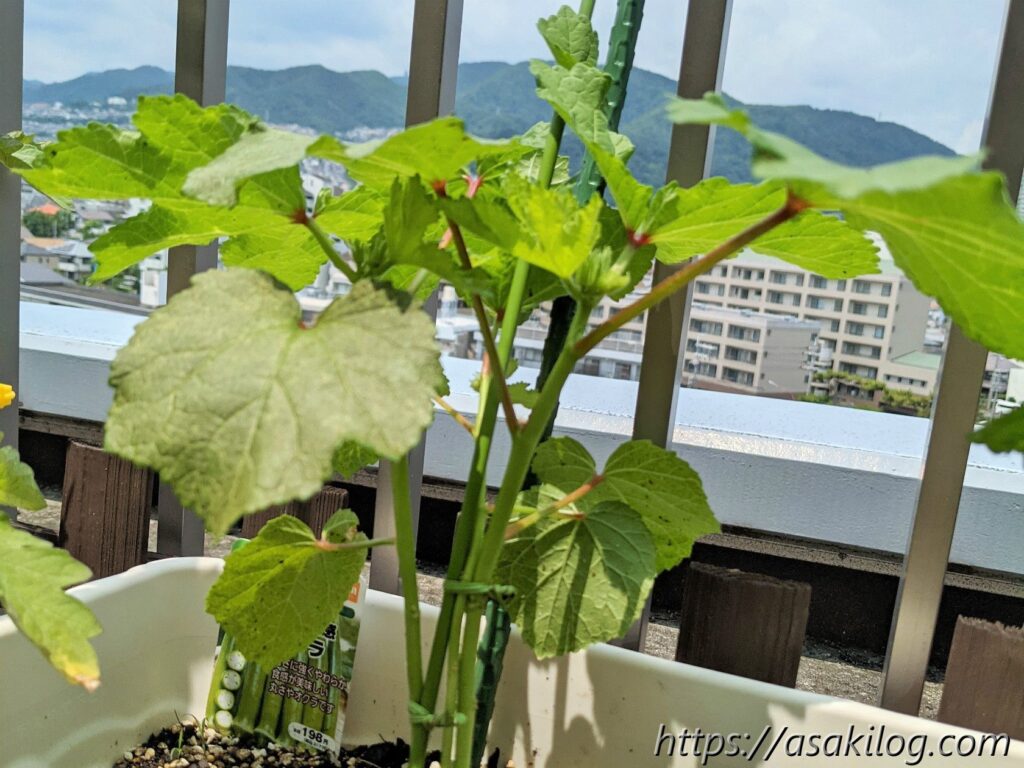 オクラの苗って意外と崩れやすく、植え付けてすぐの時は少し弱った感じに見えましたが、10日もすれば↑写真のように葉がシャキッ!となり安心しました。茎がひょろひょろで折れちゃいそうだったので、割りばし支柱しています。