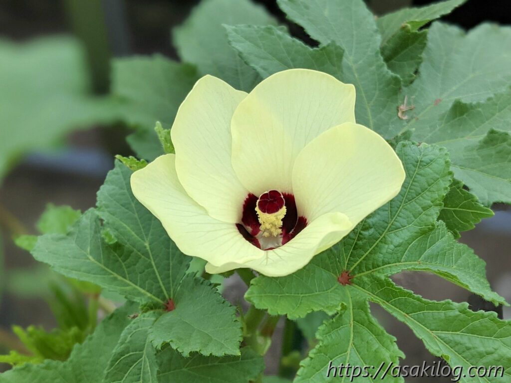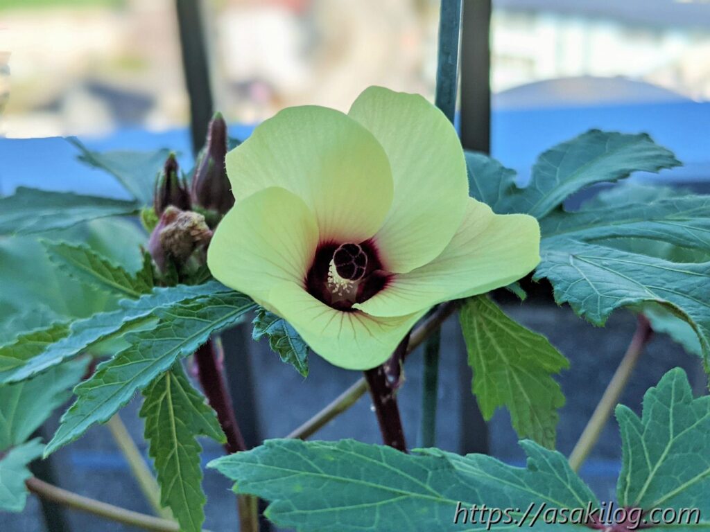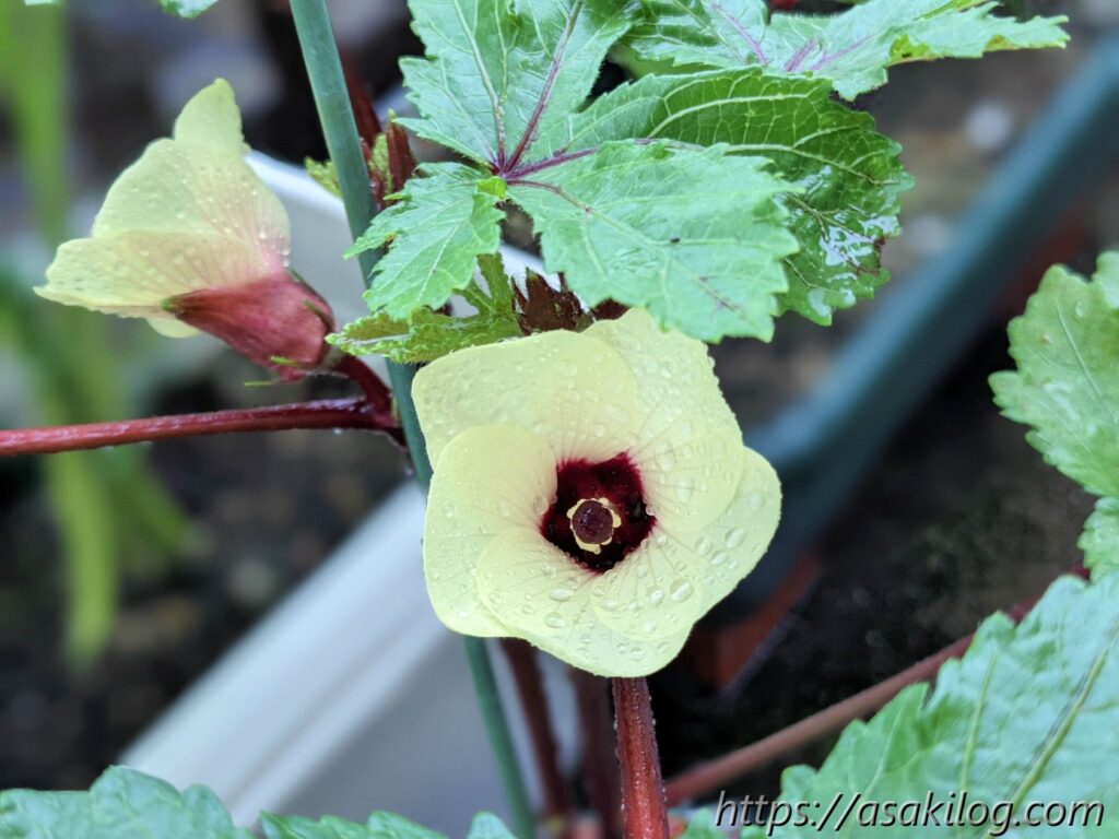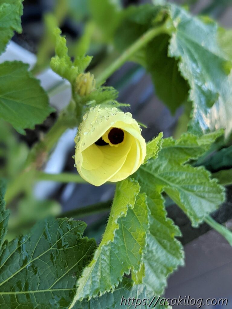 7月7日、赤オクラの花が咲き始めました。黄色い花がめちゃ可愛い!