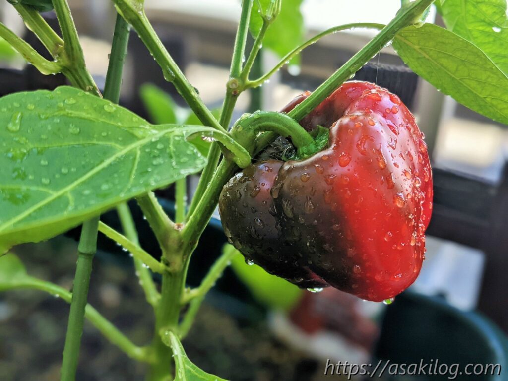 7月18日、ようやくパプリカ(赤)が色付き始め、7月22日に初収穫しました。