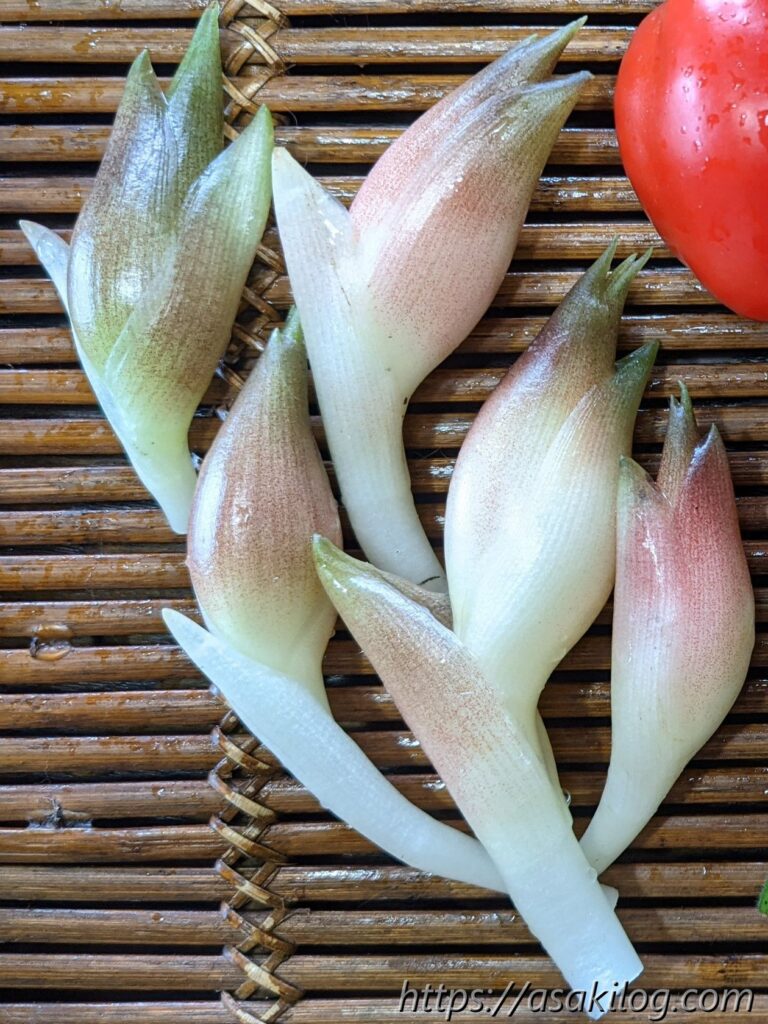 ツイッターのフォロワーさんより「土をのけてぷっくりしてたら採っても大丈夫。花が咲くと中がスカスカになるため、花が咲く前に収穫しちゃいましょう」とアドバイス頂き、ついに初収穫。当たり前ですが、ミョウガのいい香りがします。