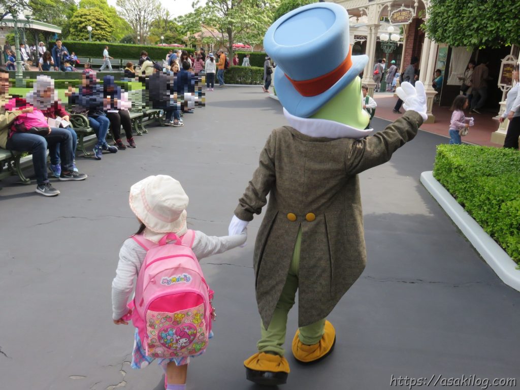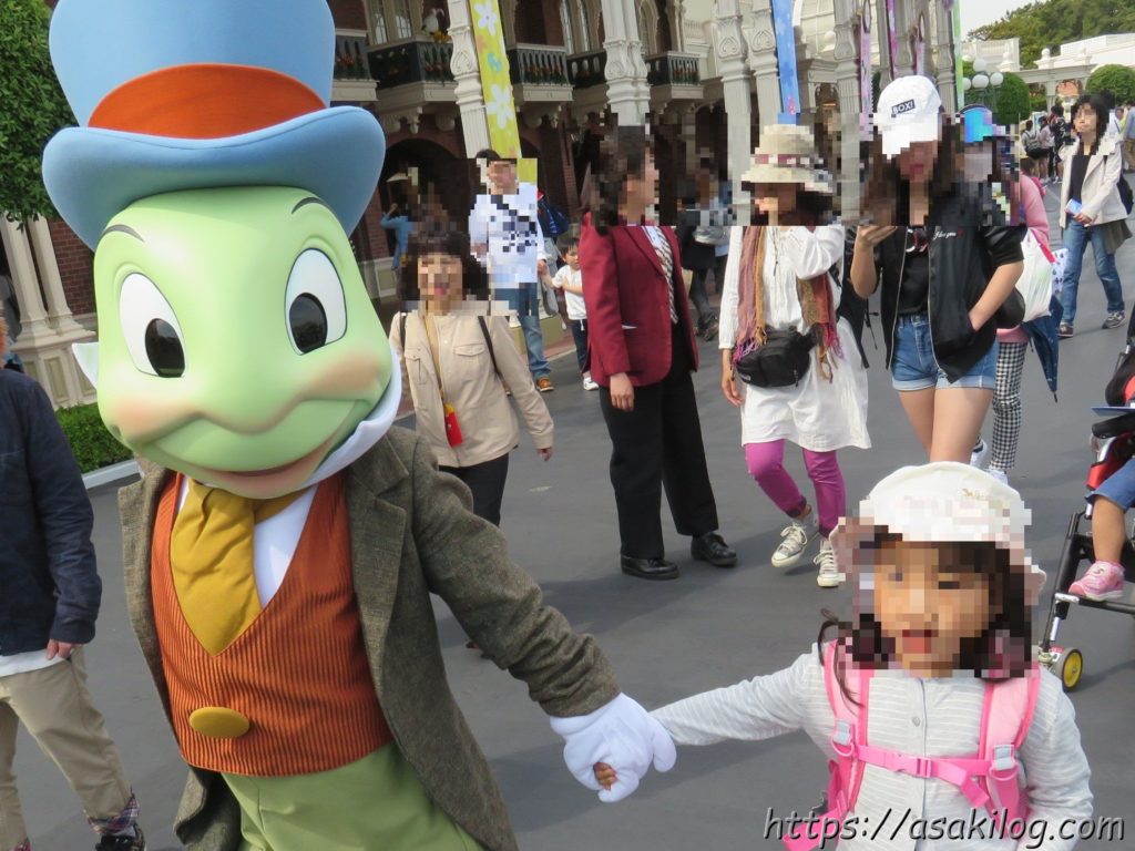 うちの娘さん、さすがにうんざりしてるかな?と思った矢先・・・なんと、ジミニー・クリケットを独り占めです(笑)手まで繋いで、なんだかうれしそうに二人で仲良くお散歩。