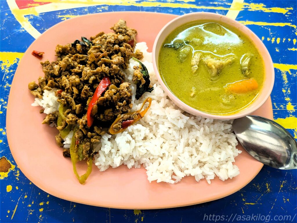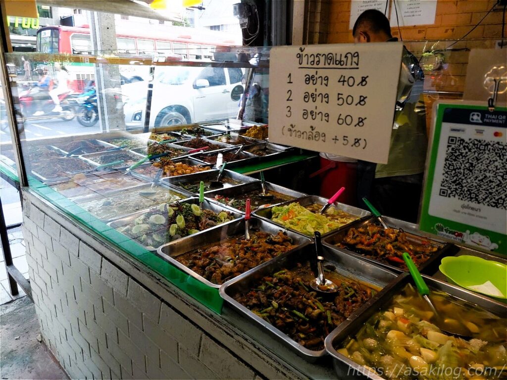 こちらのお店では、おかず1つで40THB・2つで50THB・3つで60THBです。これは辛くない?など質問しつつ選んだ結果、